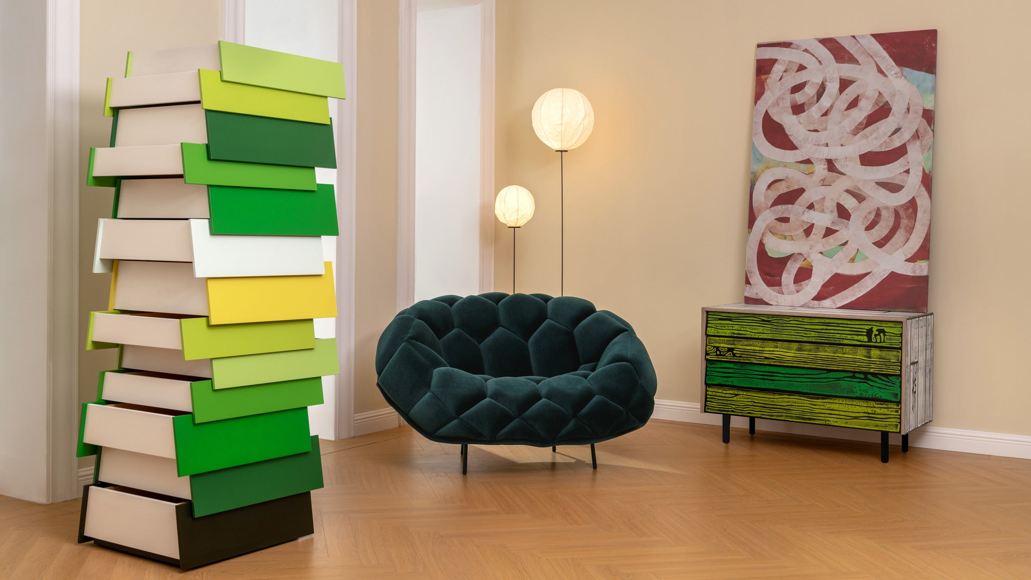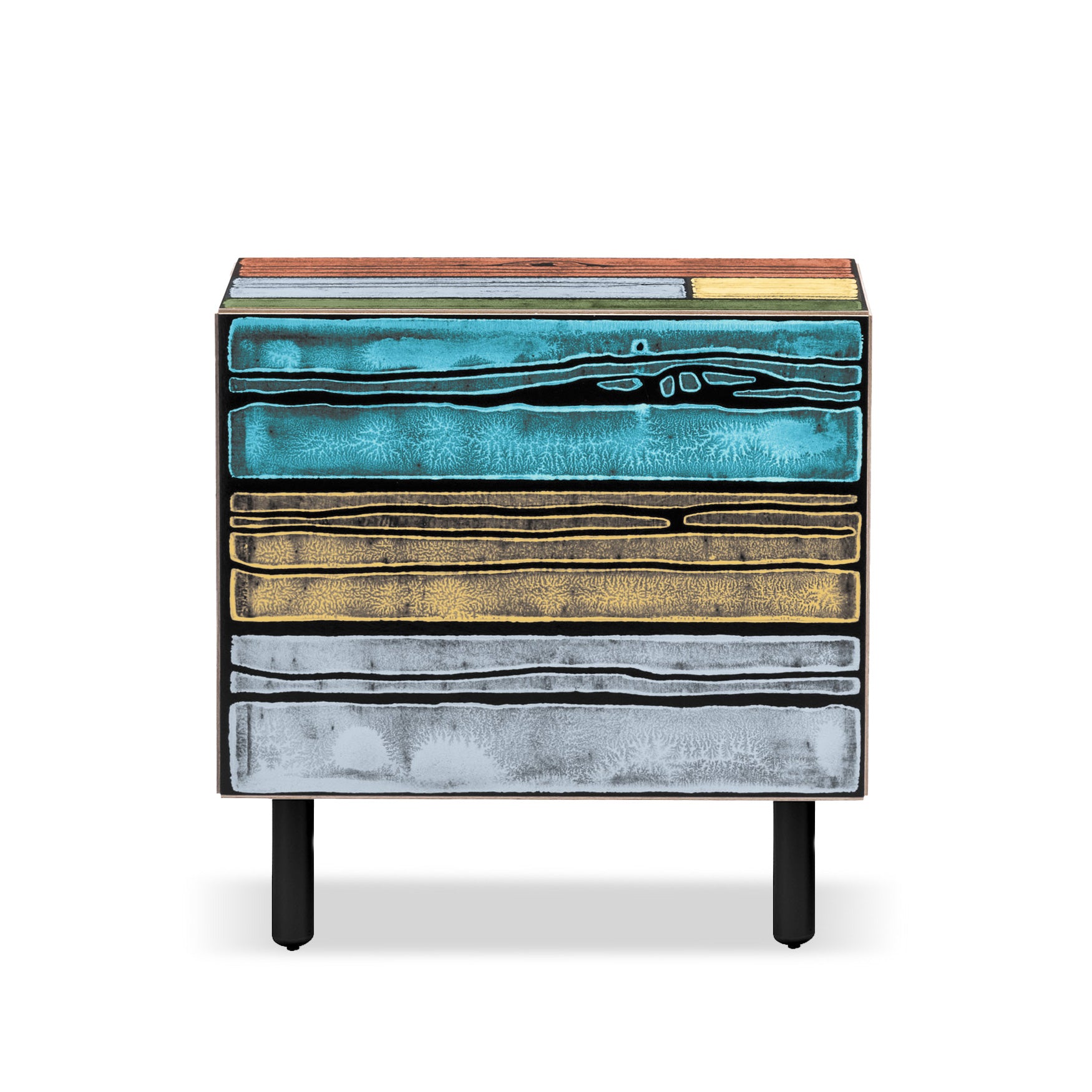 Fabrics have been emblematic in the expression of new codes of communication developed by Memphis since its inception in 1981. This distinctive textile legacy was forged by Ettore Sottsass, George J. Sowden, and Nathalie Du Pasquier.
