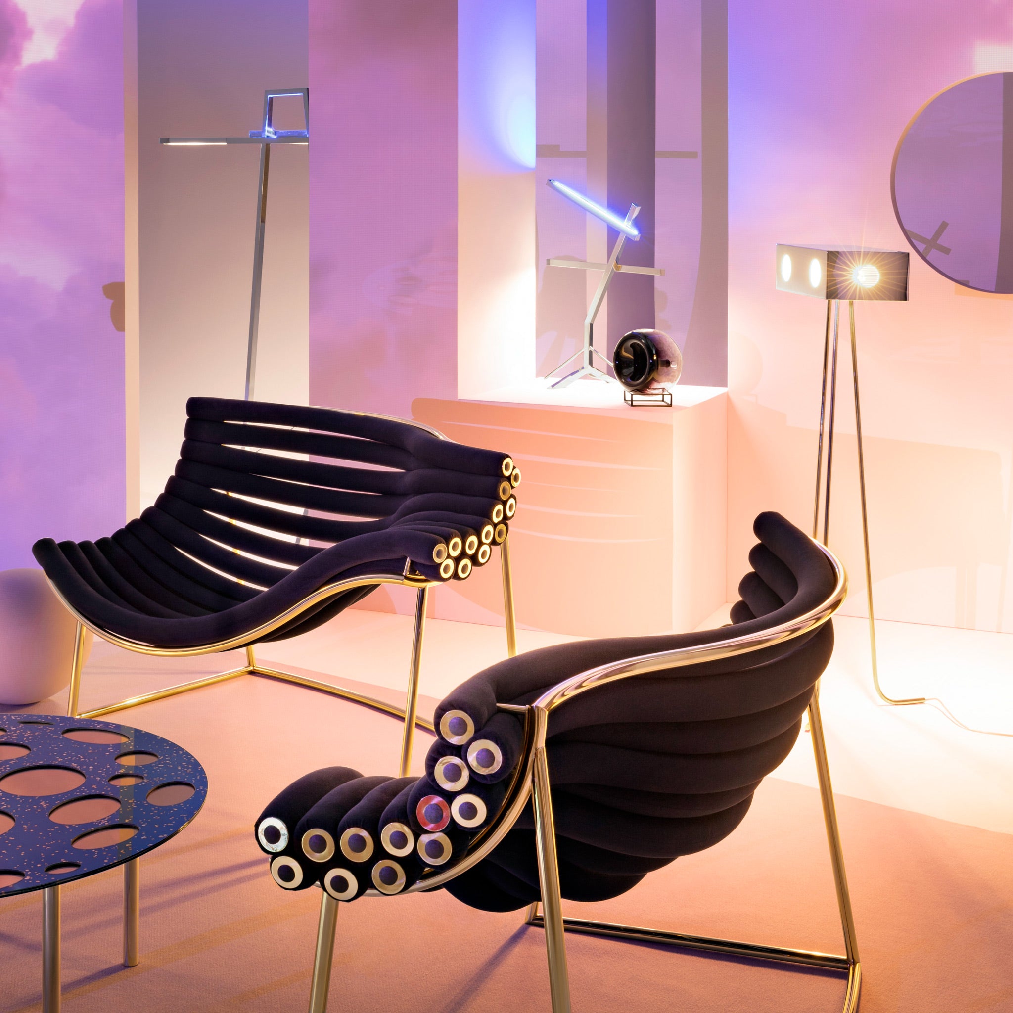Like in a revealing frame, these connections become visible, crystallising in the sinuous curves that constitute the sitting and the back of this armchair: a static piece of furniture that becomes an iconic, dynamic item.