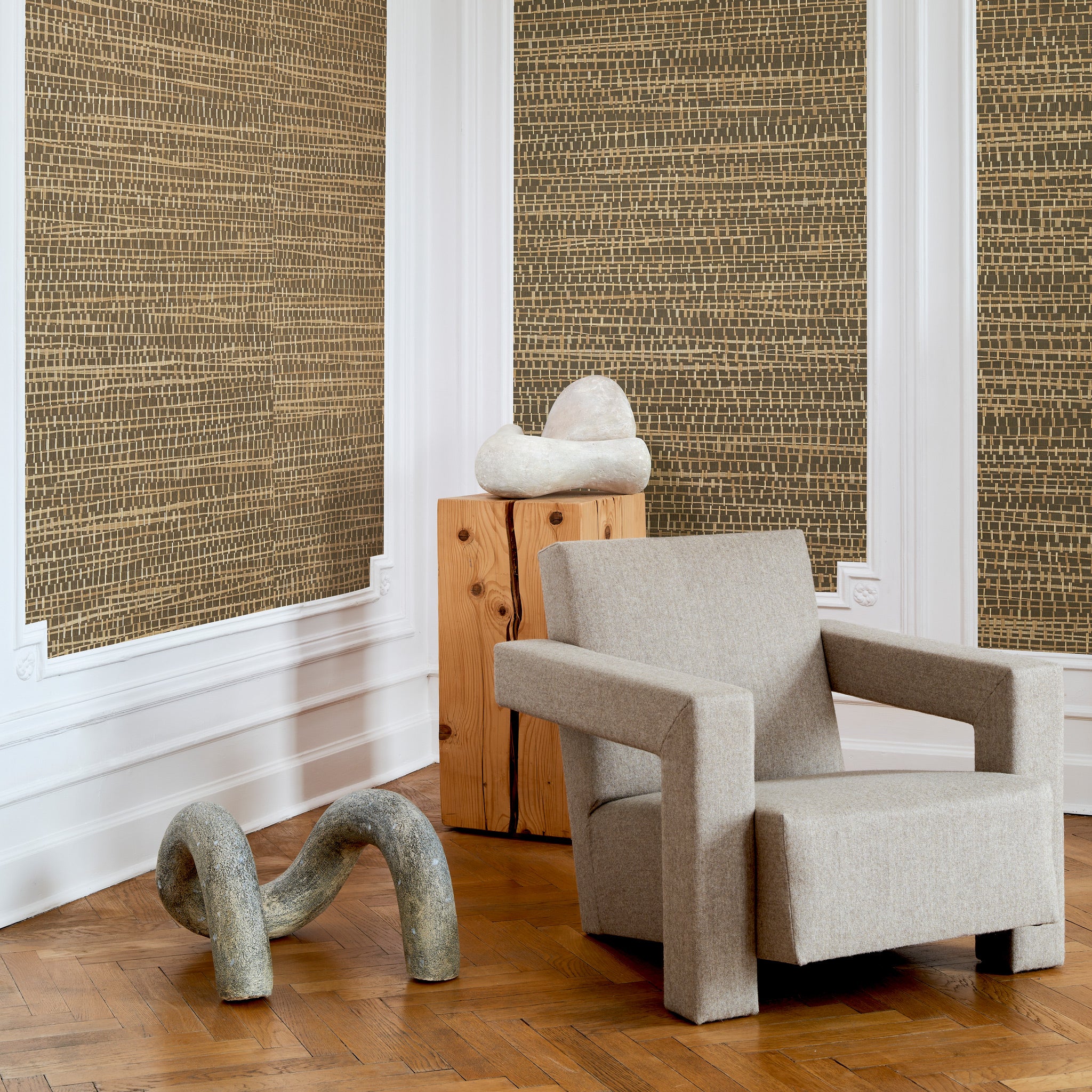 The Ruban design plays with different thicknesses. Narrow raffia strips are glued by hand to a non-woven backing, which in turn is cut into wider strips. These strips are woven into a whole using an ultra-fine thread, ensuring a successful interplay of narrow and wide.