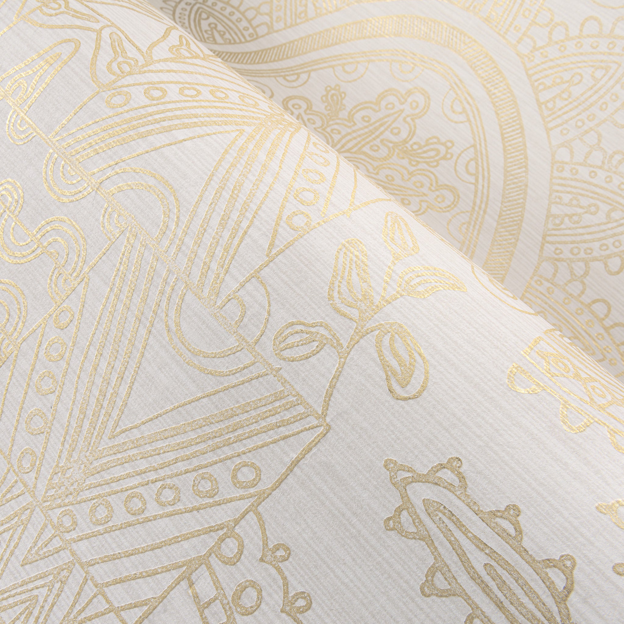 Embellished with scrolls, flowers, and other decorative details, Joie Wallpaper is a stunning wallcovering. The elegant Paisley pattern features teardrop-shaped figures and subtle curves, with striking gold accents.