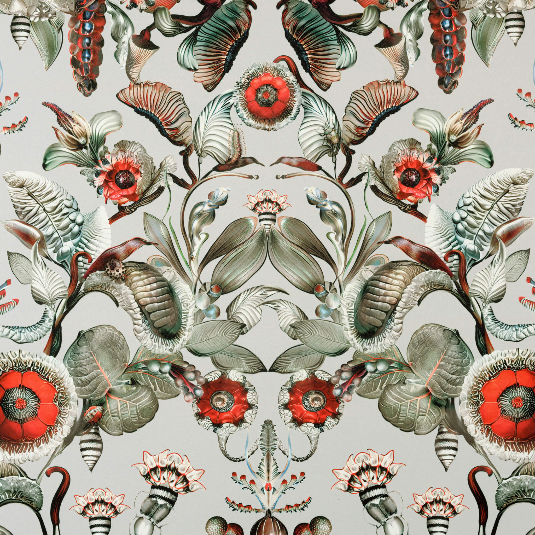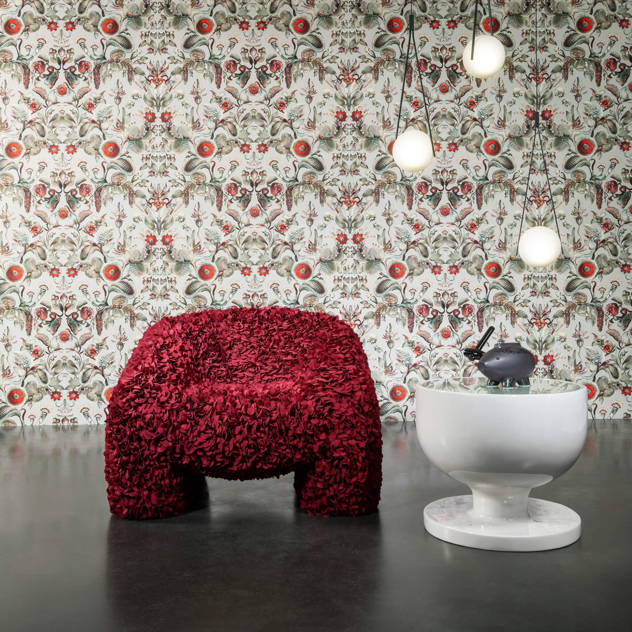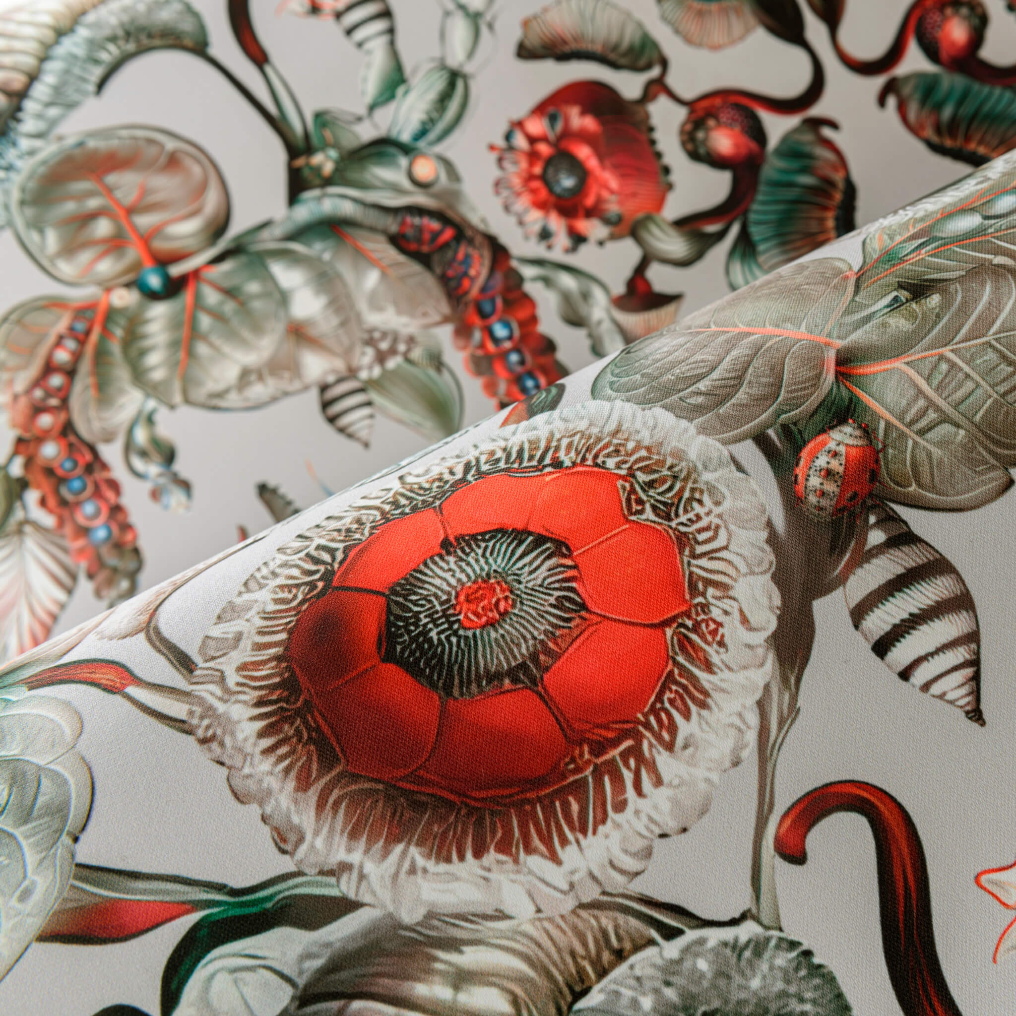 Inspired by the unique flowers and plants that were deeply loved by the extinct lady bugs Rationalis Decoris Coccinellidaeis. Coccinella Bella wallcovering is digitally printed on soft touch textile.