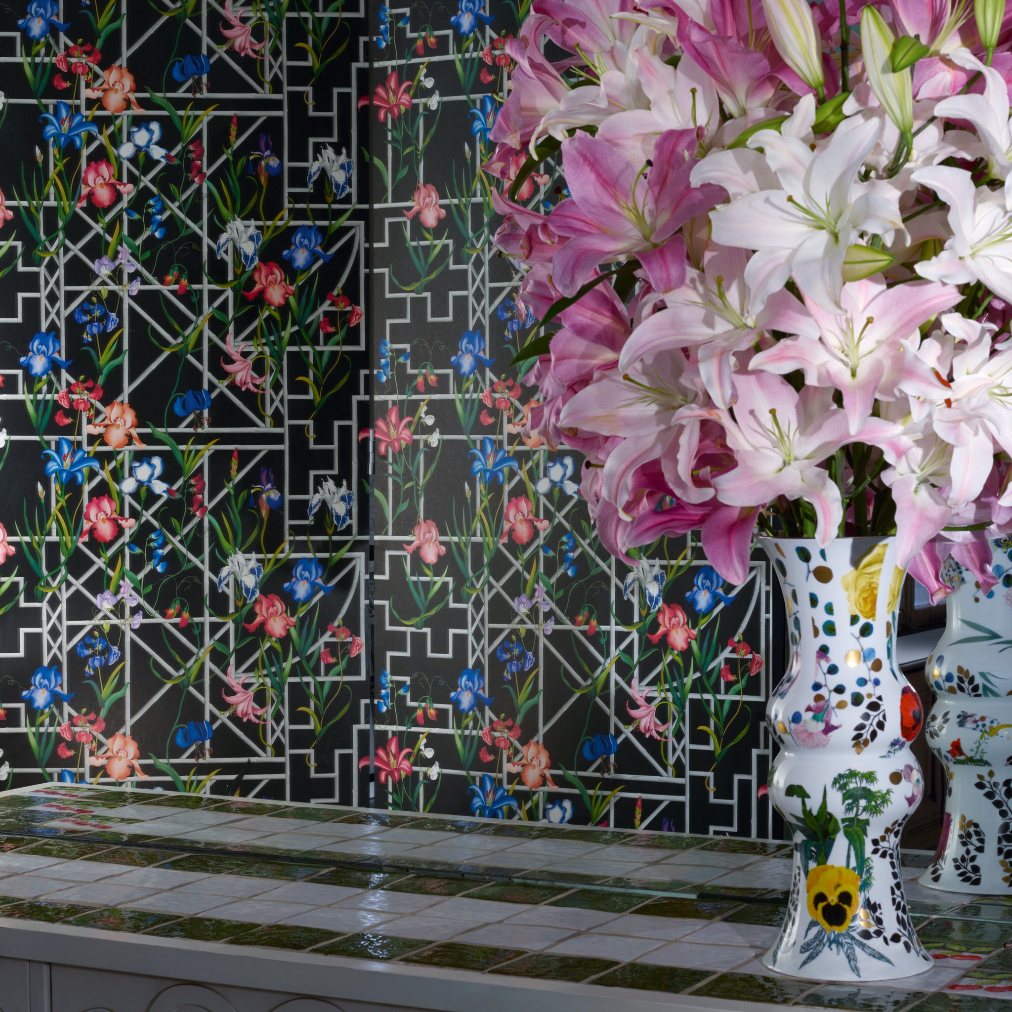 Reminiscent of an elegant winter garden, climbing bamboo and exotic irises are arranged in an artful panorama. This statement floral wallpaper by Christian Lacroix Maison is gravure printed onto smooth non-woven ground in four colourways, some with metallic grounds. Coordinating panoramic wallpaper and fabric also available.