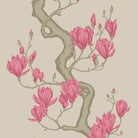 Magnolia Tree wallpaper is based on an archive design with hand-painted magnolia flowers, inspired by Orientalist styles from the Victorian era. It features delicate blossoms in soothing color combinations like Charcoal and Soft Pink, Sky Blue and Blush, and Metallic Taupe and Magenta, creating a calming environment. A Soft Cream and Powder version is also available in two silk textures, highlighting the elegant climbing pattern. This wallpaper brings timeless beauty and refined style to any space.
