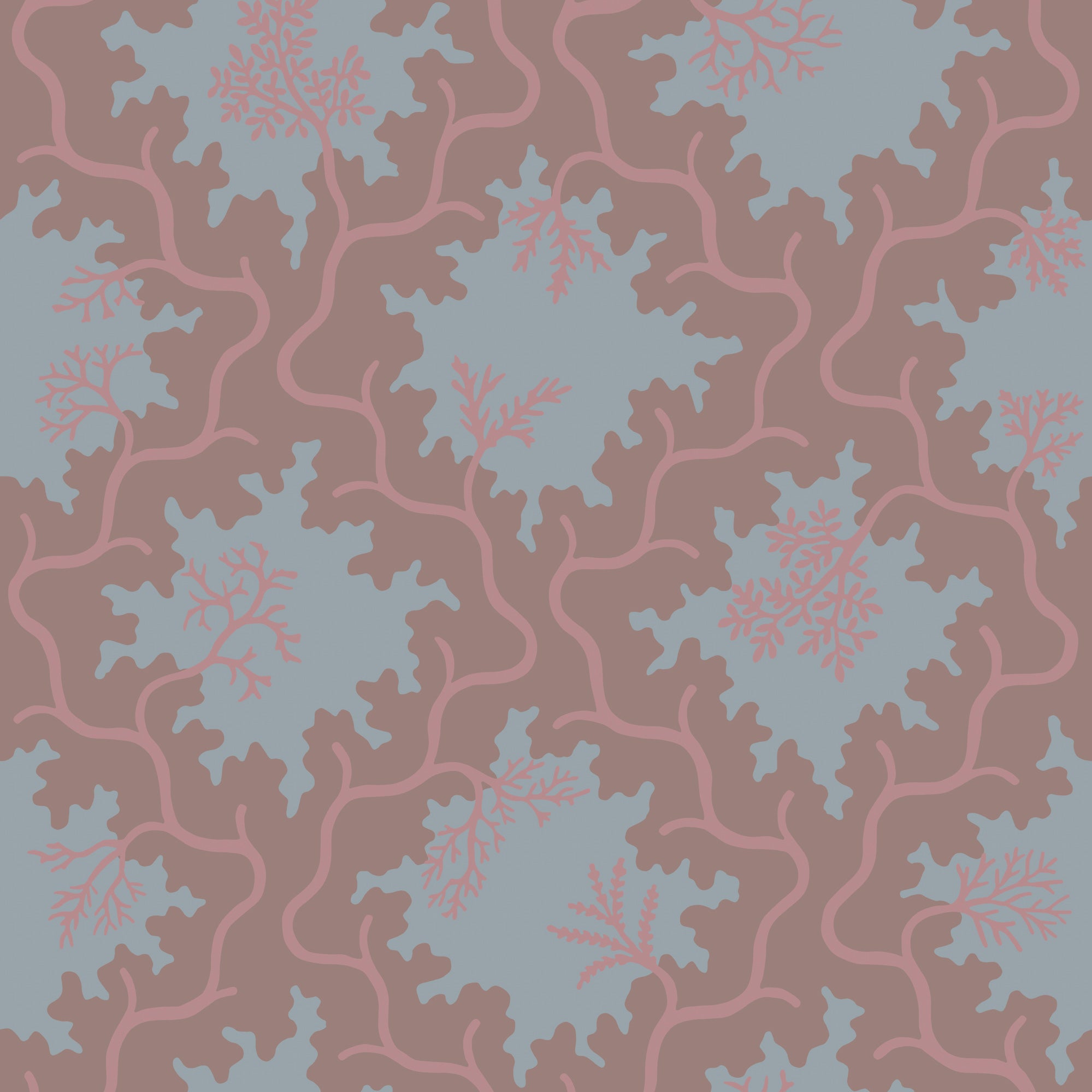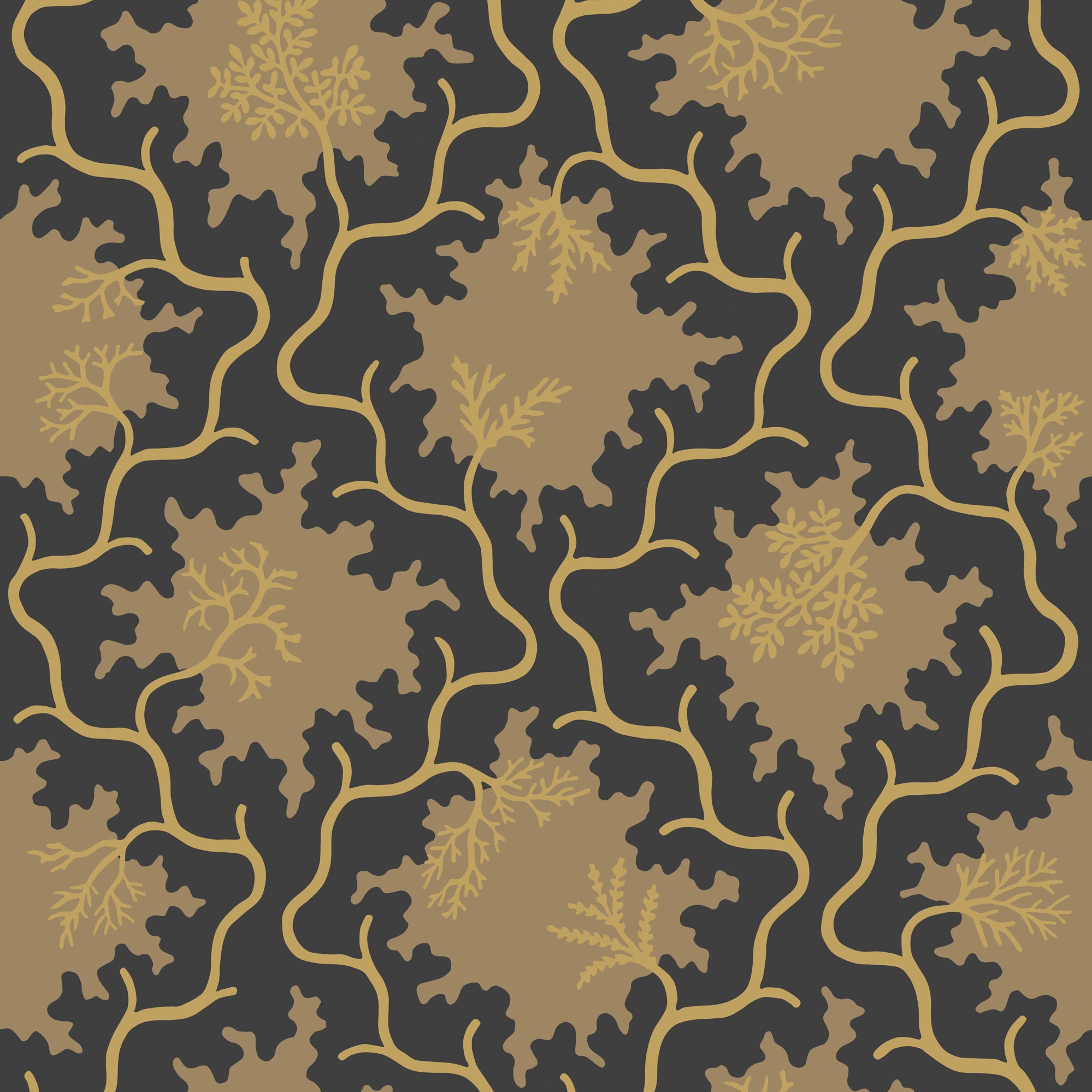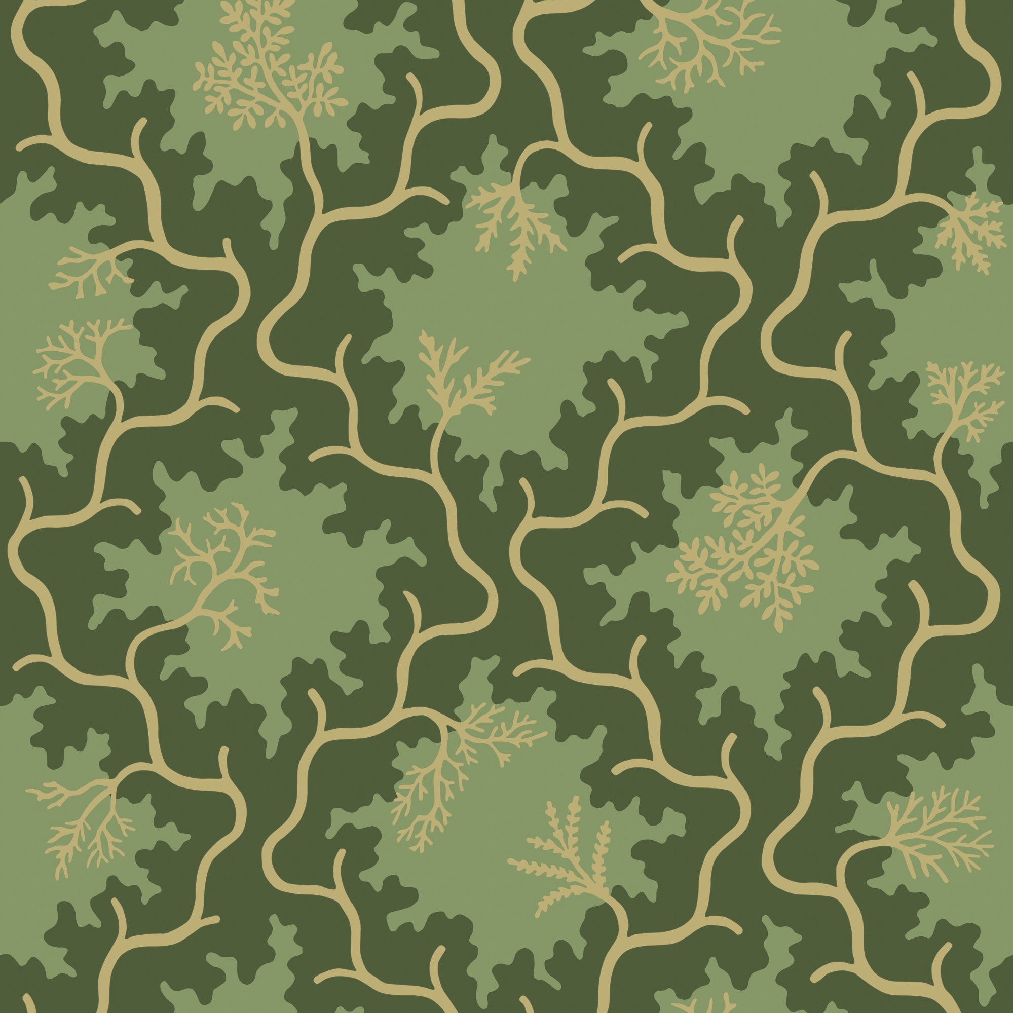 Moss Trellis features a large-scale pattern originally created in 1935, showcasing a bold, abstract style that transcends its 1930s origins. The design is available in subtle, rosy shades like Soft Coral with Shell Pink, and Steel paired with Rose. Modern earthy tones such as Evergreen with Antique Gold and Matcha with Pistachio update the look for today’s interiors. The Black and Gold version, enhanced with metallic accents, adds a luxurious touch to this timeless motif.