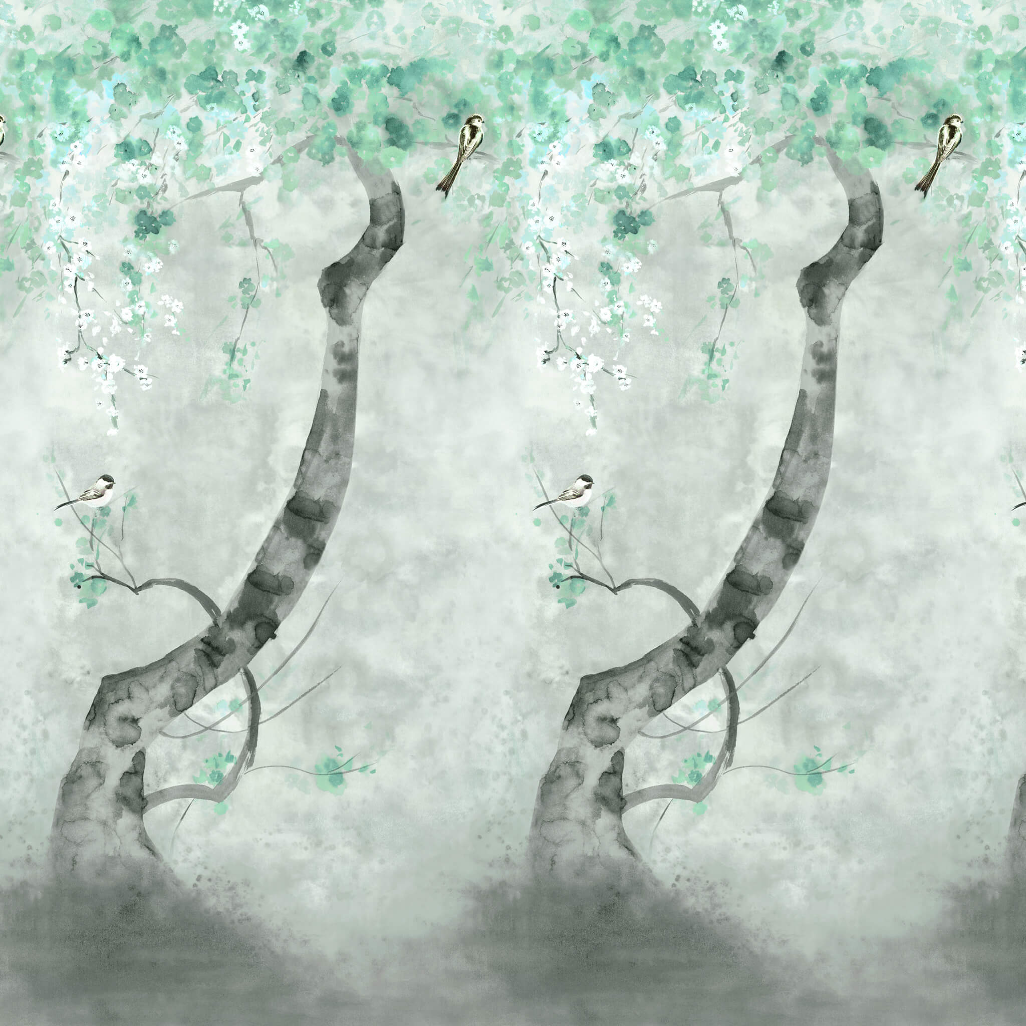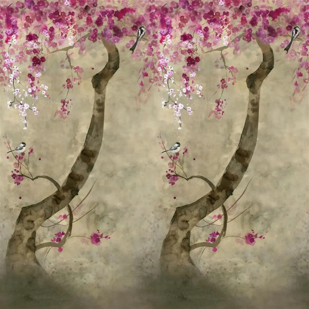 A solitary cherry blossom tree takes root amidst a painterly, natural hued and delicately dappled ground. Sold as a single roll incorporating 2 x matching lengths to be hung in sequence to create a complete panel 140cm wide x 300cm high. Can be joined in multiples according to your wall width and trimmed in the height if required.