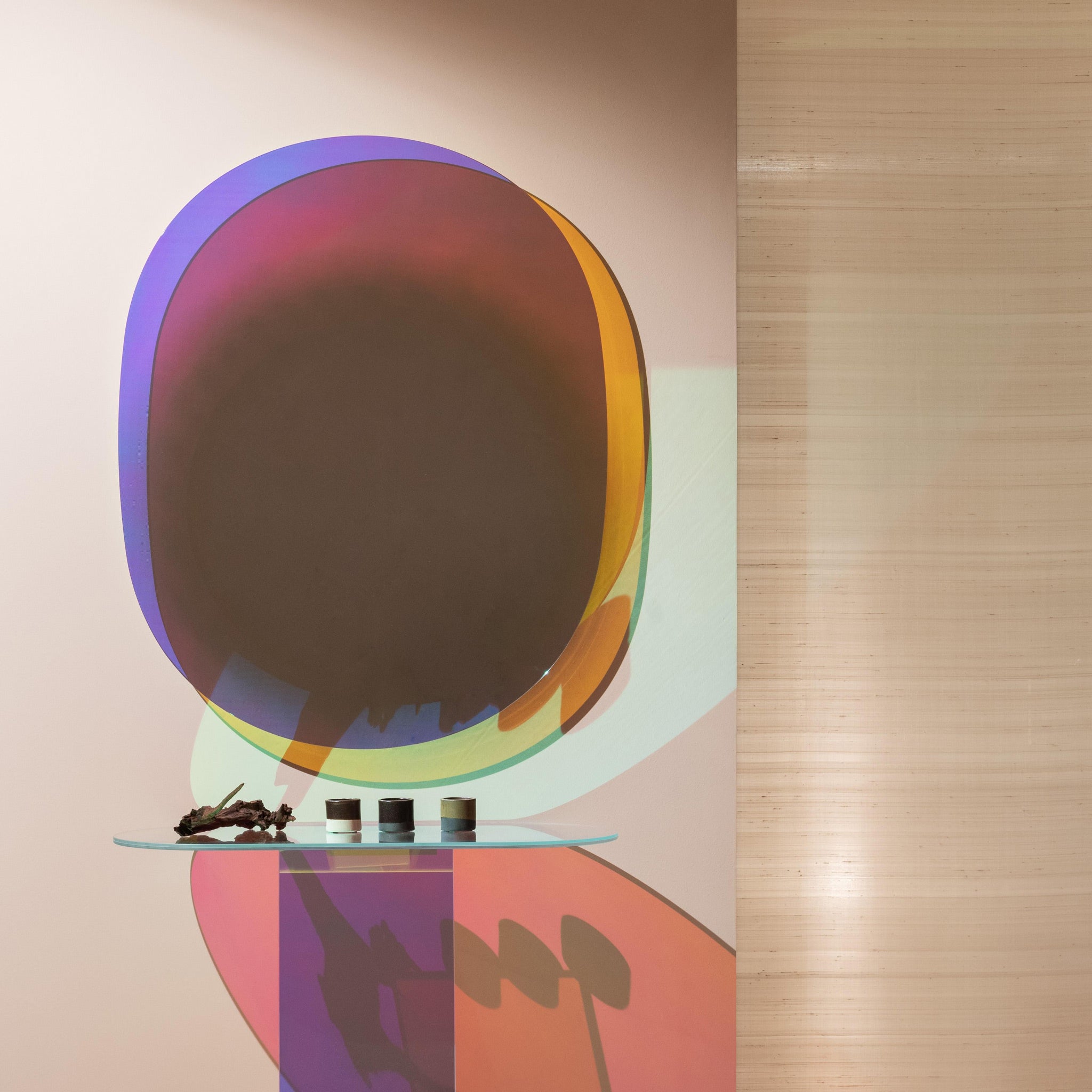 Designed by Patricia Urquiola for Glas Italia, Shimmer is characterized by its magical and ethereal appearance. Depending on the vantage point and the incidence angle of light, it displays an infinite variety of nuances, a result of its iridescent and multicoloured finish. The Shimmer collection features side tables, dining tables, mirrors and a console table.