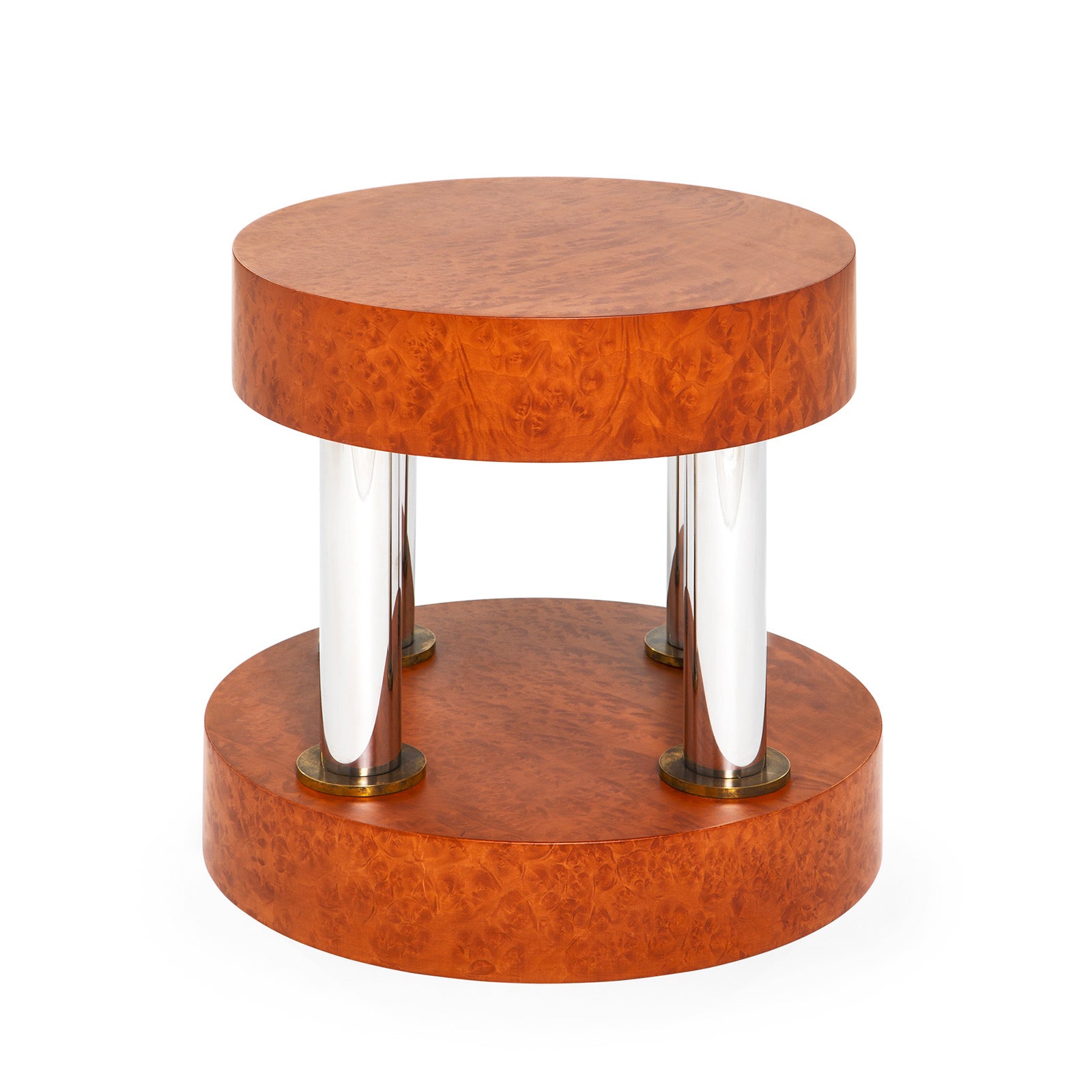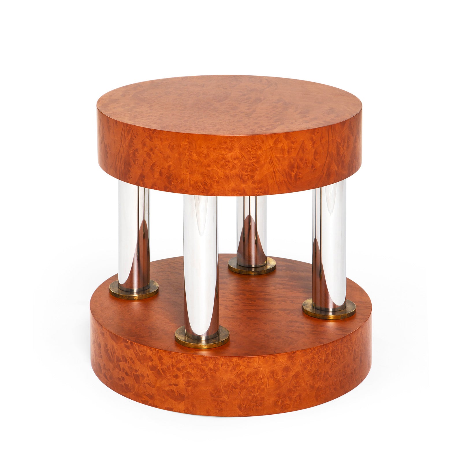 Hyatt, an iconic low table, masterfully makes cylindrical shapes interact in a symmetrical silhouette that presents identical base and top. In both the precious wood essence is combined with reflective materials: mirror and chromed metal.