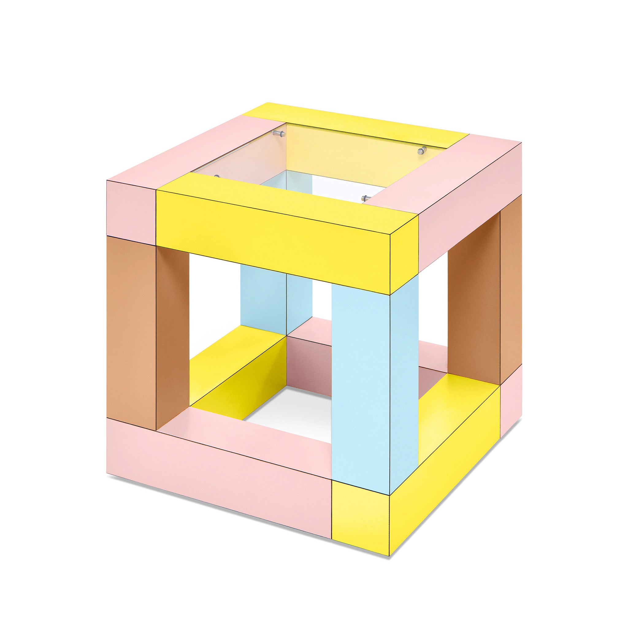 Designed by Ettore Sottsass in 1984, this table is crafted from plastic laminate in thick, square-section elements boasting pale blue, yellow, and pink, and enclosing at the top a square glass top. This eye-catching piece will be ideal for supporting and displaying small objects next to an eclectic sofa or armchair.