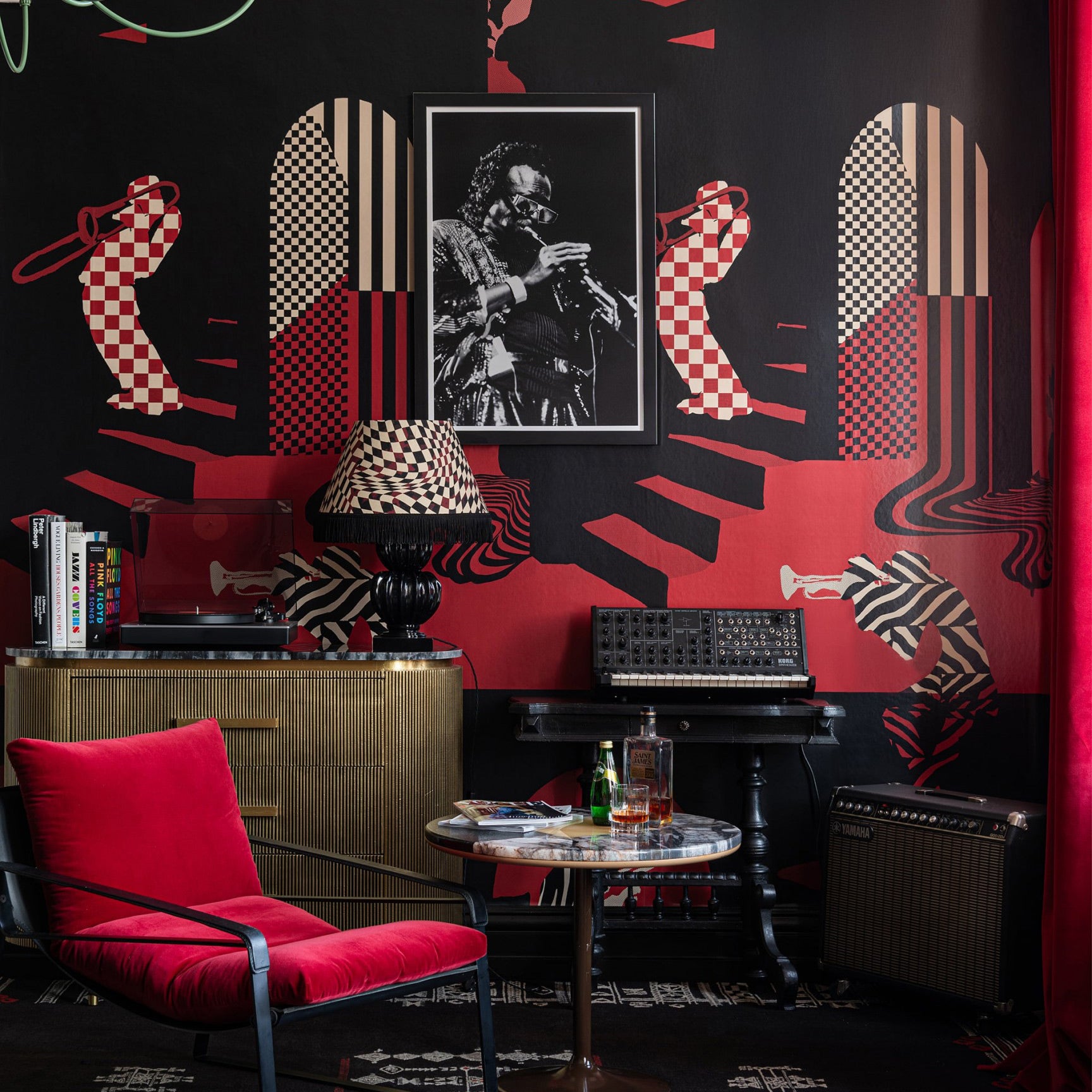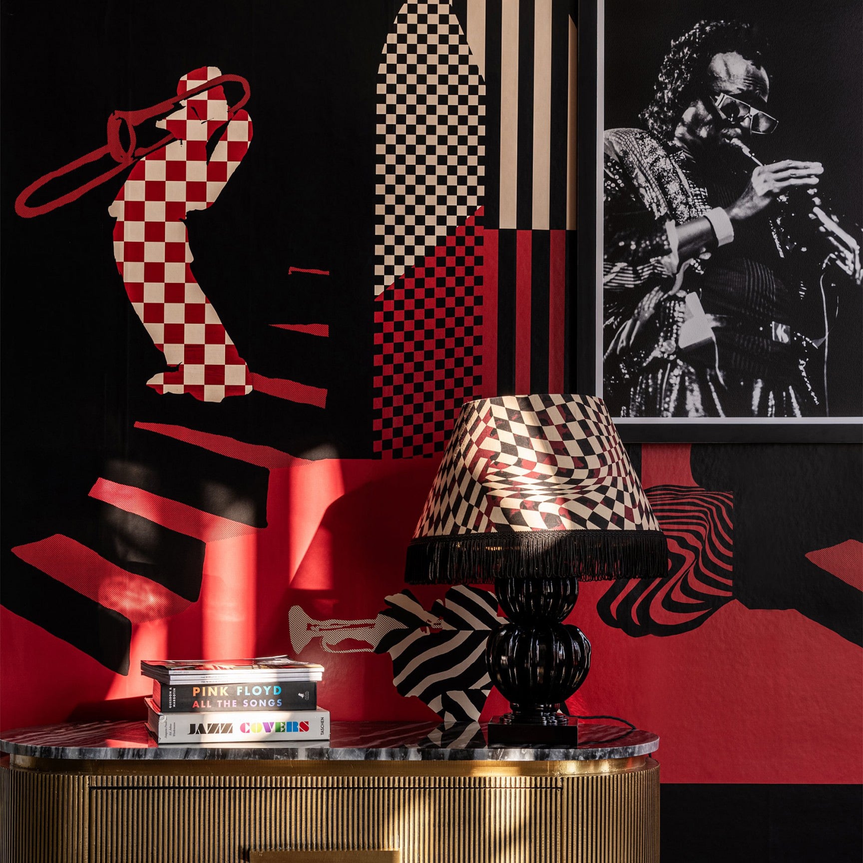 Solitude Wallpaper features dramatic monochromatic stripes and checkerboard patterns in black and red, depicting musicians in a lavish jazz club setting. Its intricate design adds depth and perspective, creating a sense of opulence in any space. Perfect for large display in the home.