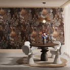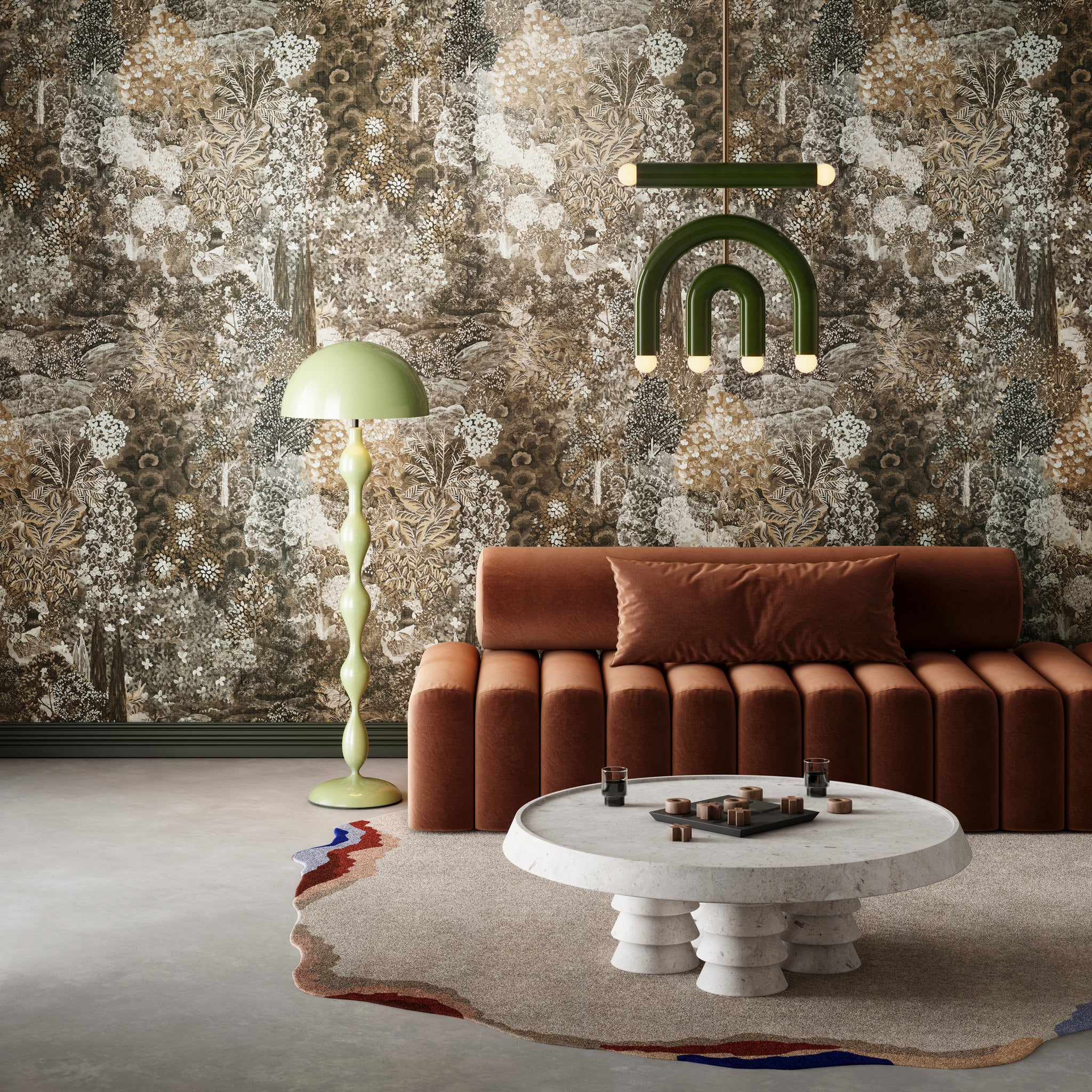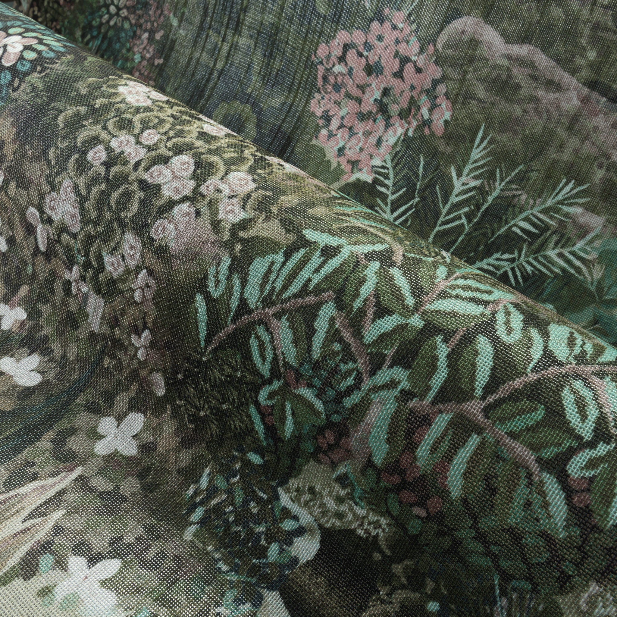 The vibrant design of ‘Forêt des Muses’ draws inspiration from the rich botanical variety found in French and English gardens. Rendered on a linen-textured fabric, this painterly pattern is enhanced by a metallic foil underlay that imparts a subtle, luminous sheen.