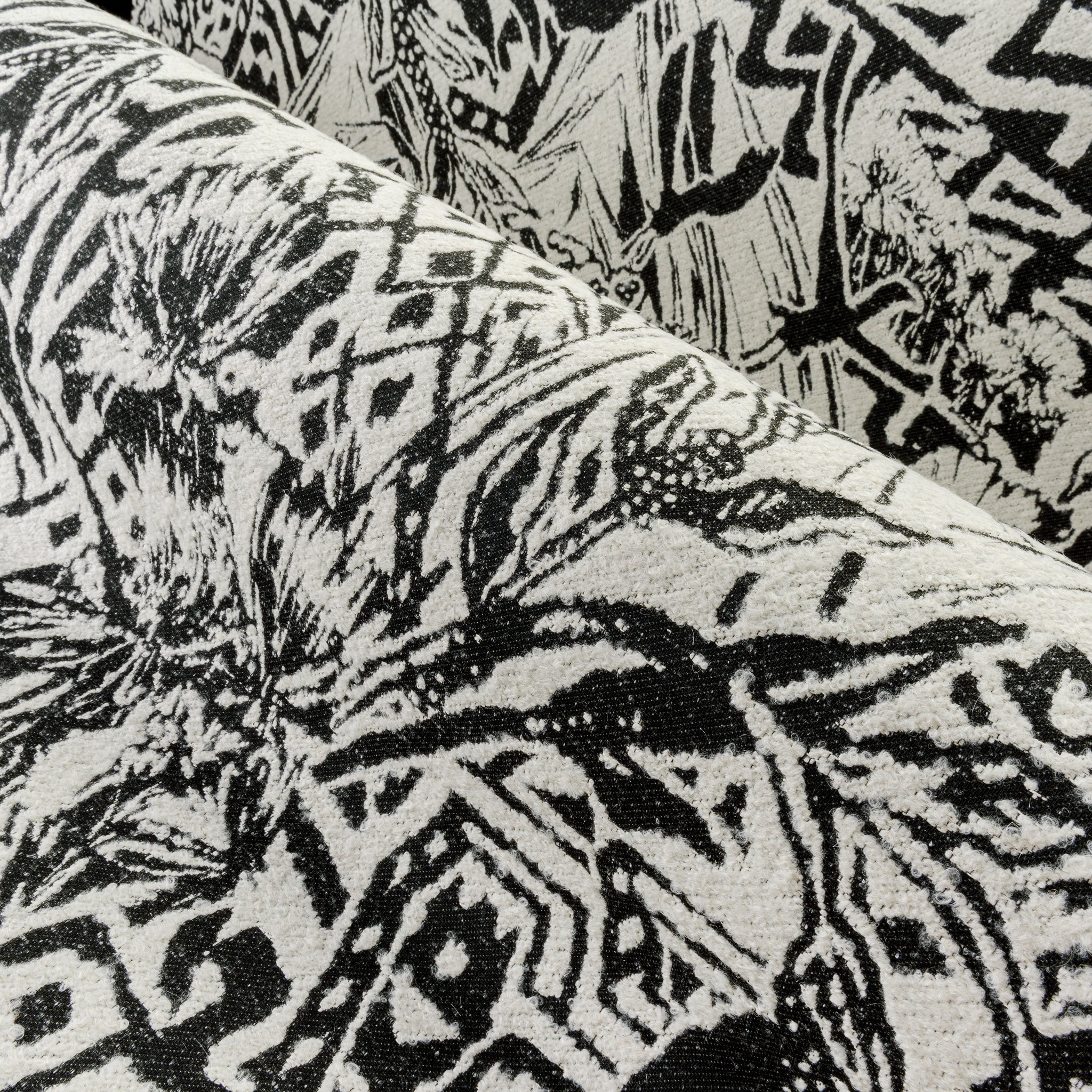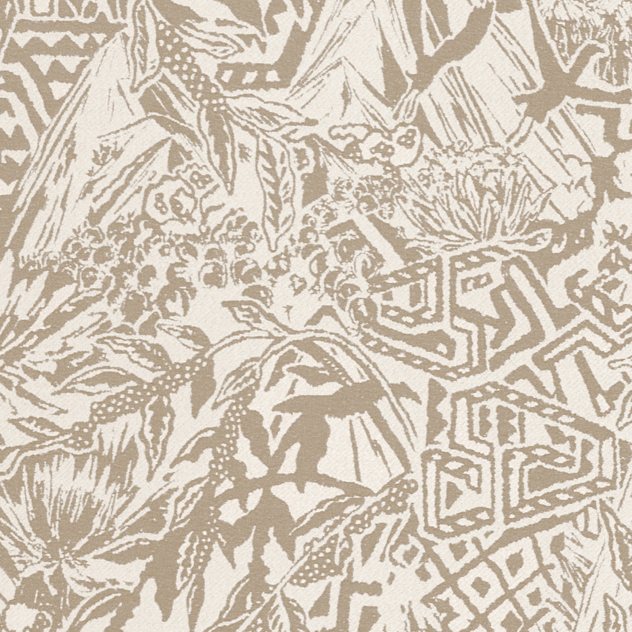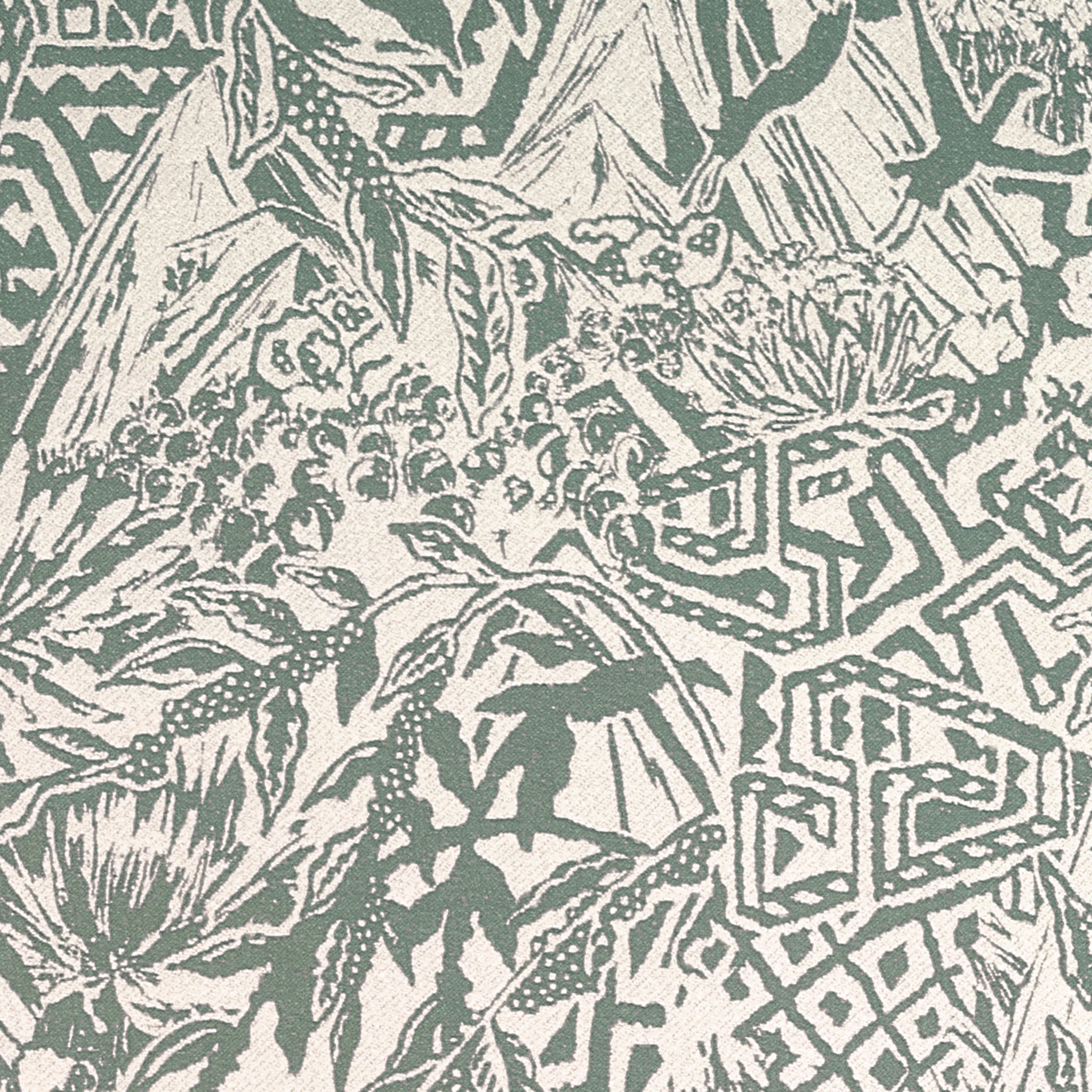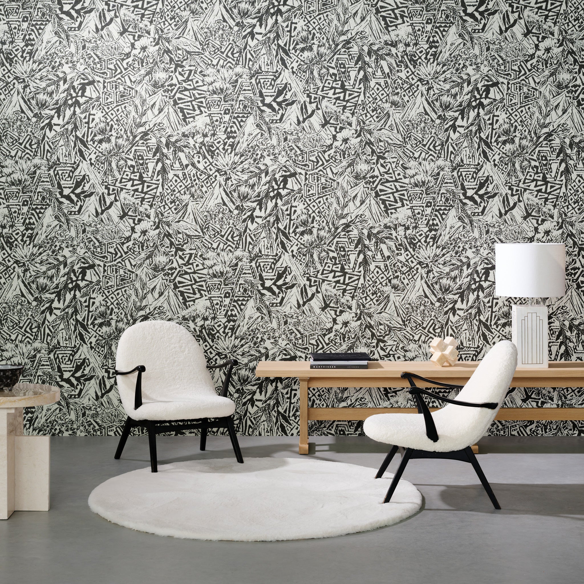 Drawing inspiration from the grandeur of the Sierra Nevada, this wallpaper features classic North American symbols such as mountain peaks, eagles, and wildflowers, intricately arranged in a refined pattern. The design is enhanced by a rich jacquard bouclé weave, lending depth and texture to the décor.