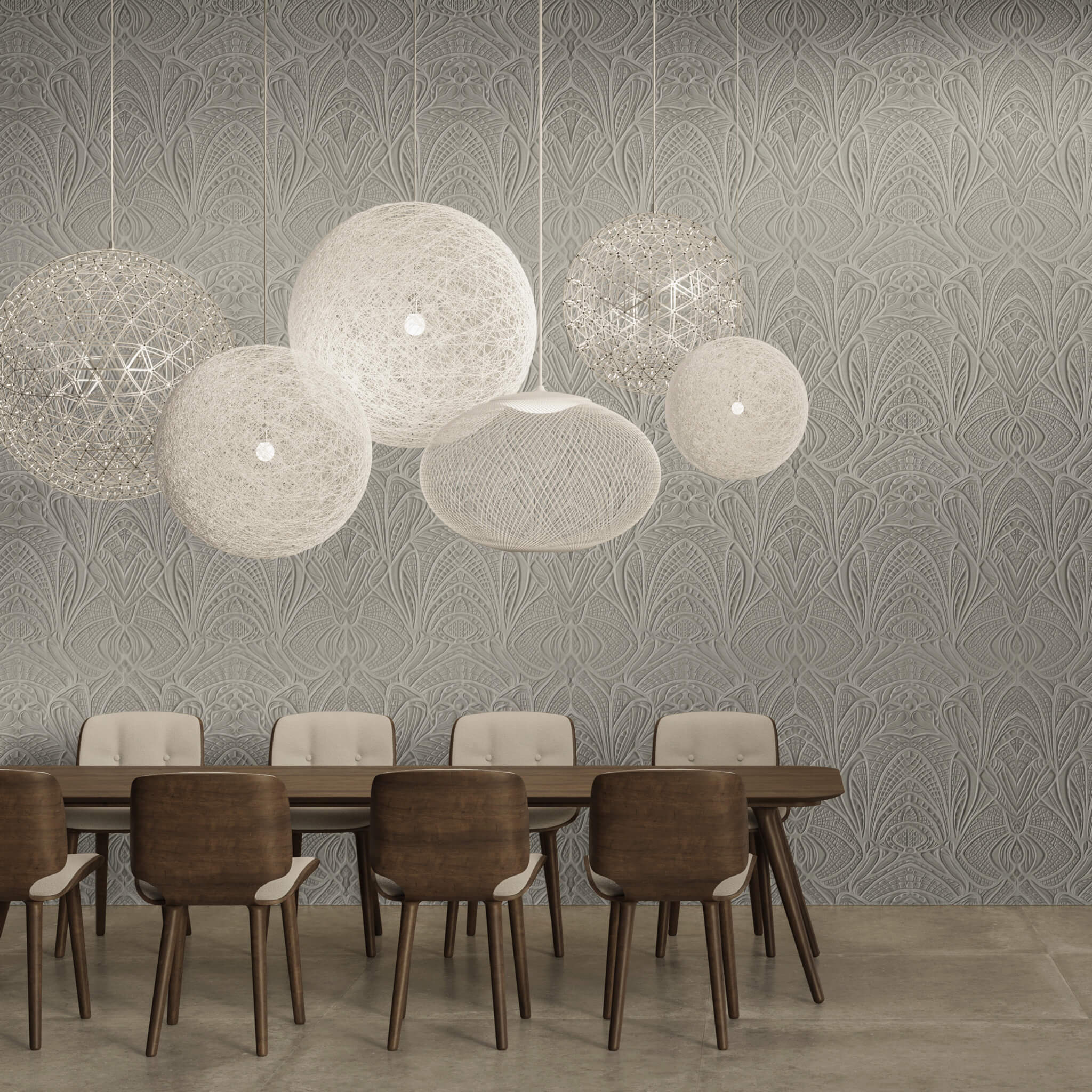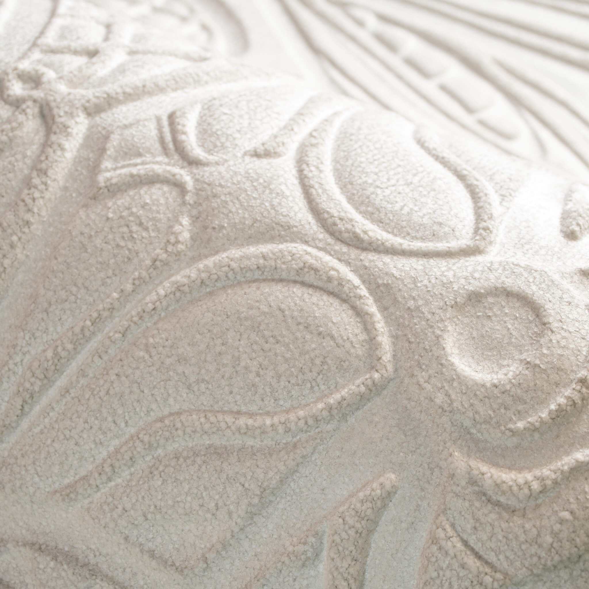 Lacy Longlegs is a tactile wallcovering that creates a soft, three-dimensional effect courtesy of the bouclé fabric. The design takes inspiration from the spider’s intricate weaves, preferred leaves and Gothic arches.