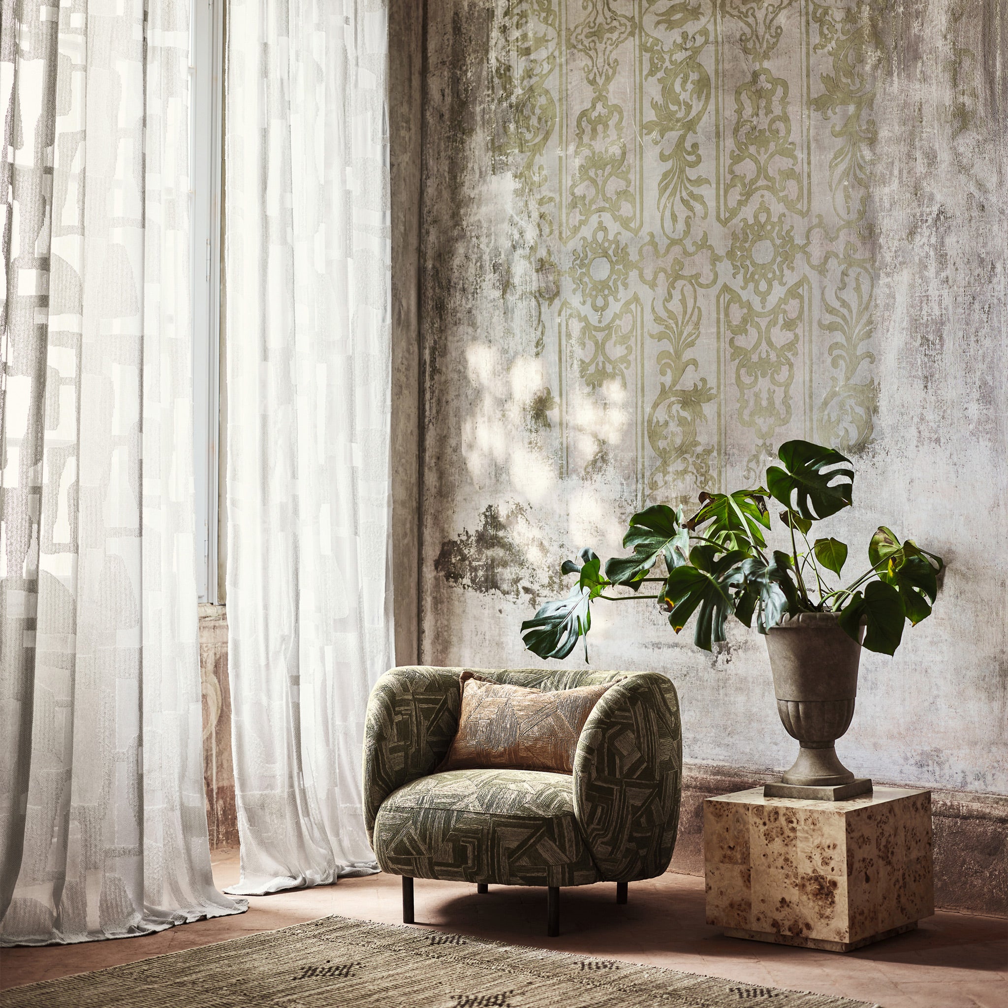 Celebrating the beauty of organic forms, this contemporary fil coupé sheer features sculptural shapes crafted from a soft wool bouclé. Stunning in appearance and texturally pleasing, Makutu casts beautiful shadows when draped.