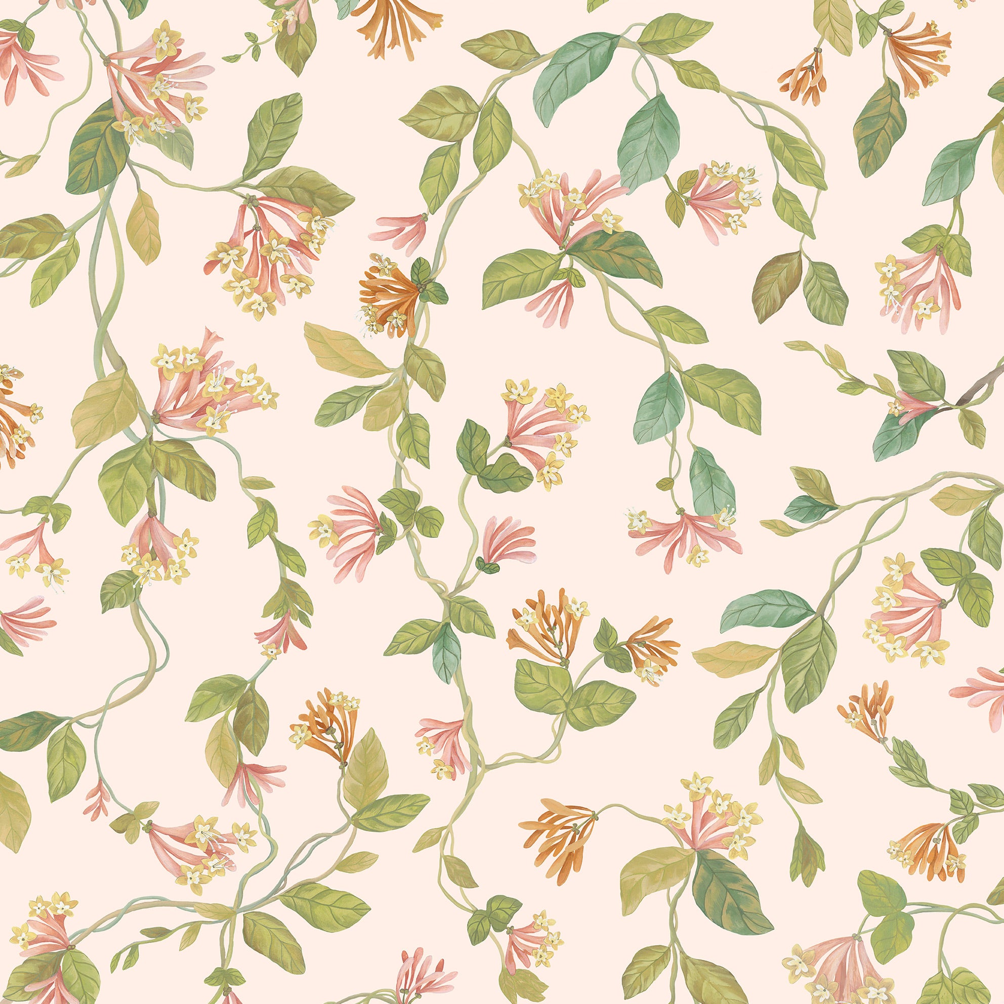 Created as a complement to Hummingbirds Flora, Flora depicts the bursting bouquets of honeysuckle to which the birds flock. Completely hand-drawn and hand-painted, this delicate floral trail is bursting with nectar waiting to be discovered.