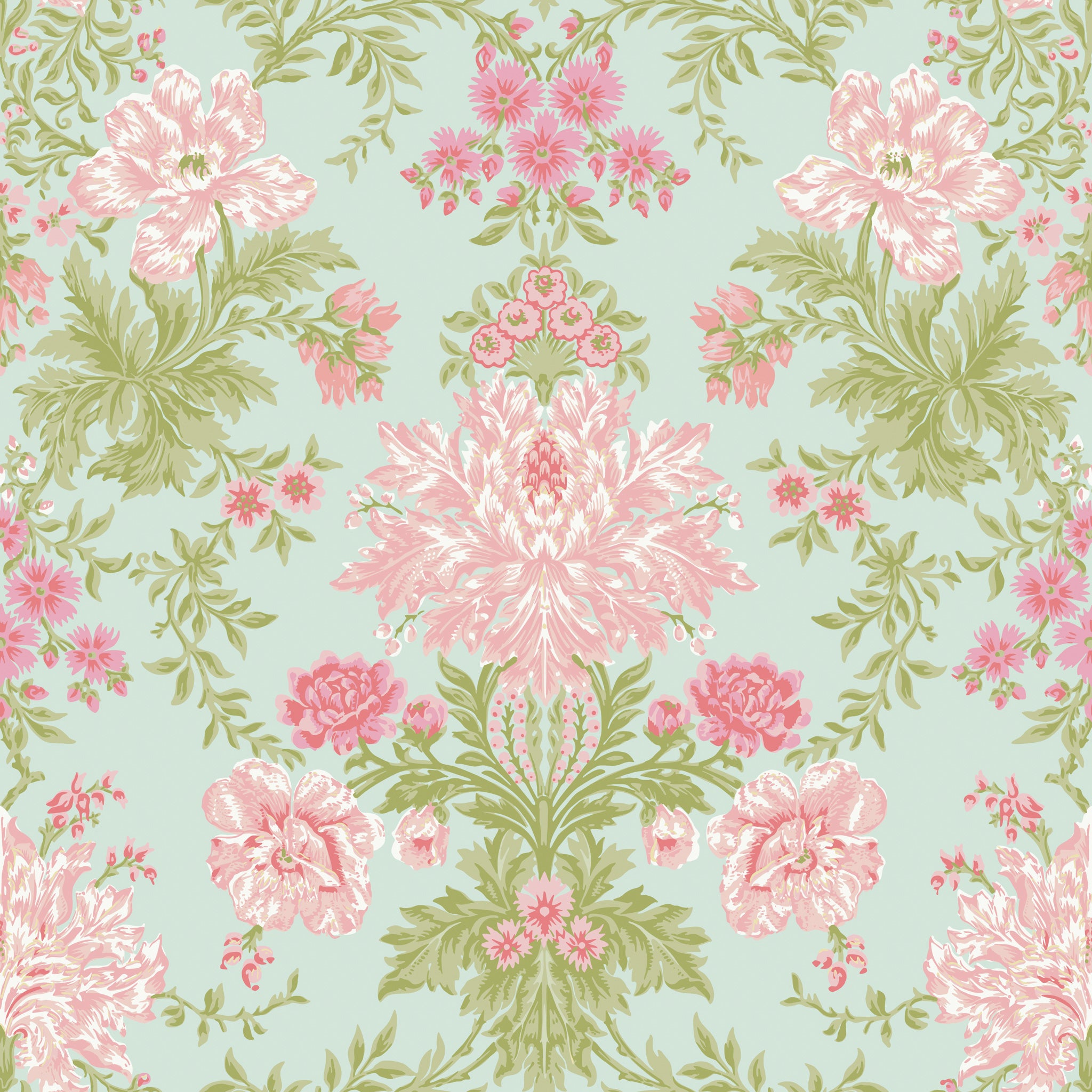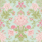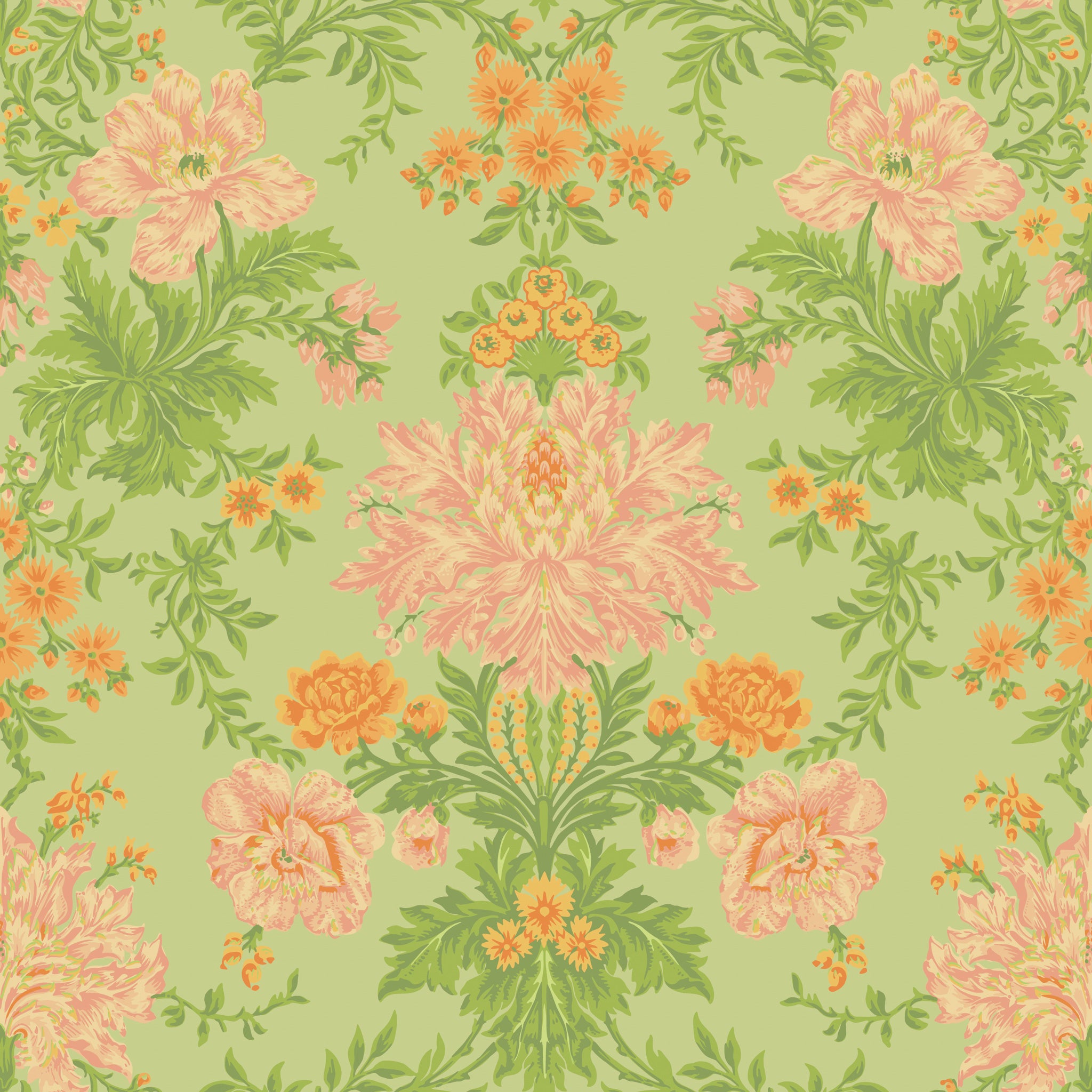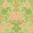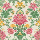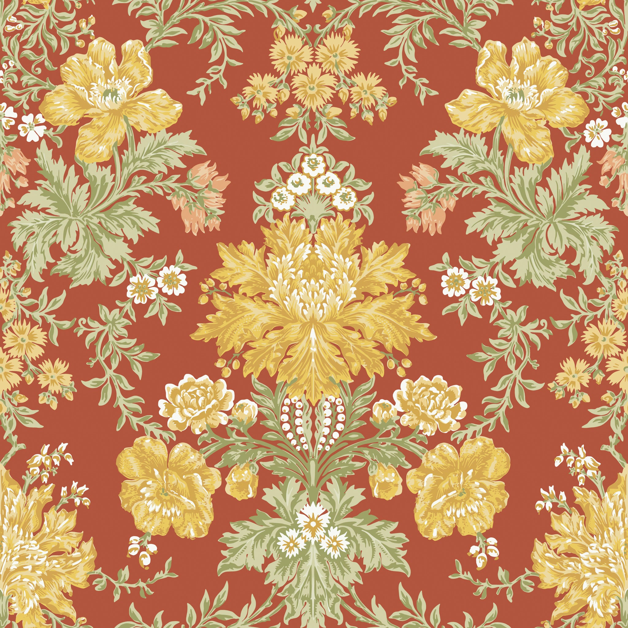 Poppies Wallpaper presents a vintage floral design featuring lush blooms and intricately ruffled leaves that form a sophisticated damask pattern. Preserving many characteristics of the original archive, the Soft Yellow, Cream, and Spring Green on Terracotta colorway offers a warm and layered effect. Additional palettes—including Soft Fuchsia, Buttercup, and Fern on Cream; Soft Pink, Blush, and Soft Green on Mint; Sapphire, Cerulean, and Moss on Stone; and Peach, Marigold, and Grass on Soft Green—bring a lively and uplifting atmosphere to interior spaces.
