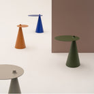 Fez is a side table with a cone-shaped base and either a round or asymmetrical top, inspired by birds balancing on small perches. The small version features a round top, while the larger has an oval top. Subtle compression details emphasize the connection between top and base, while the tabletop rotates 360 degrees, reinforcing a sense of balance and movement.