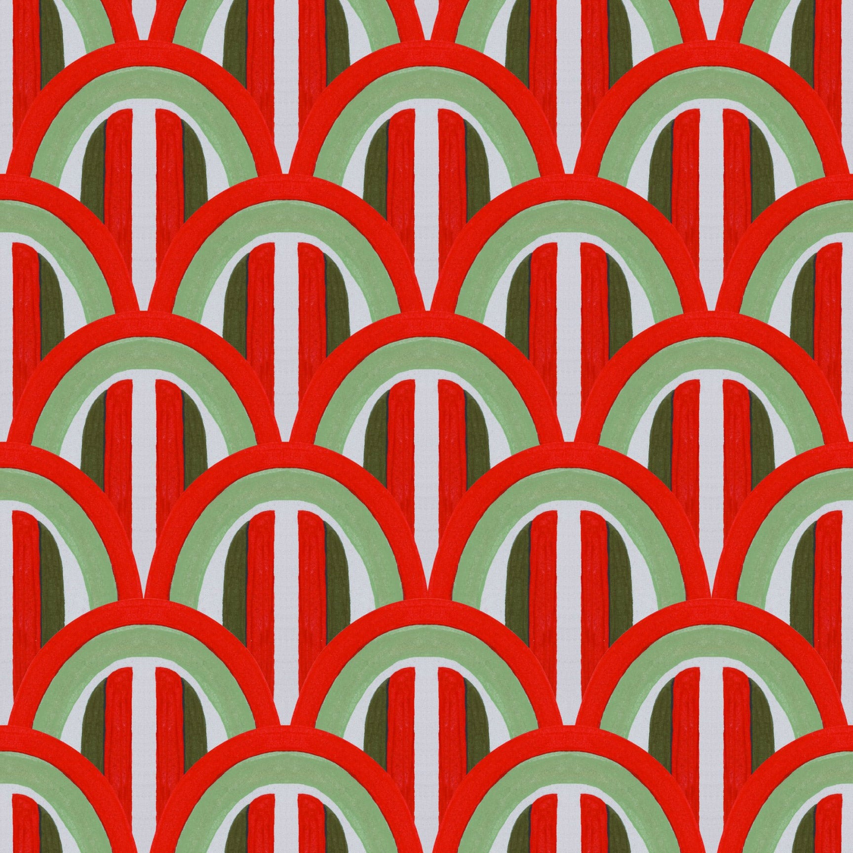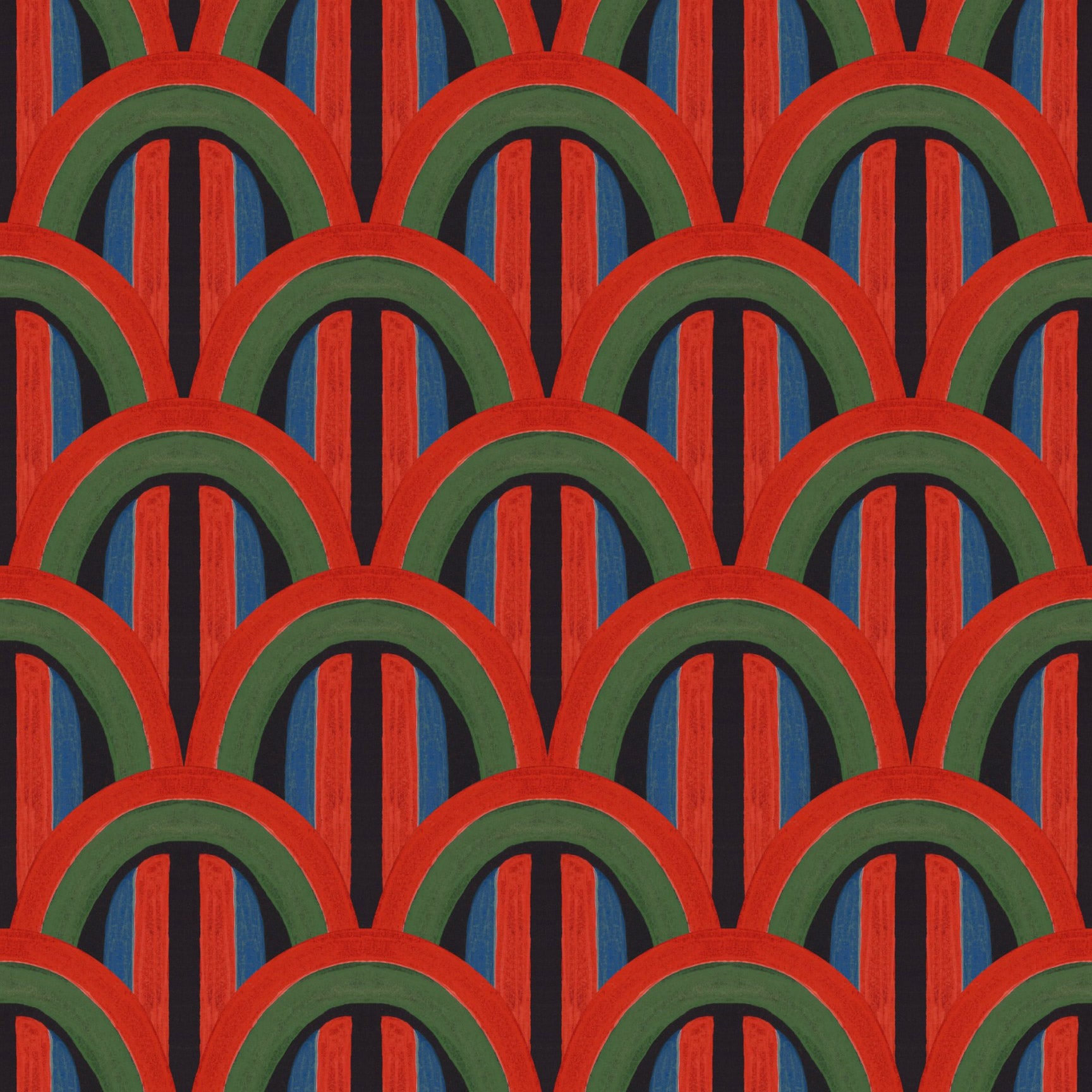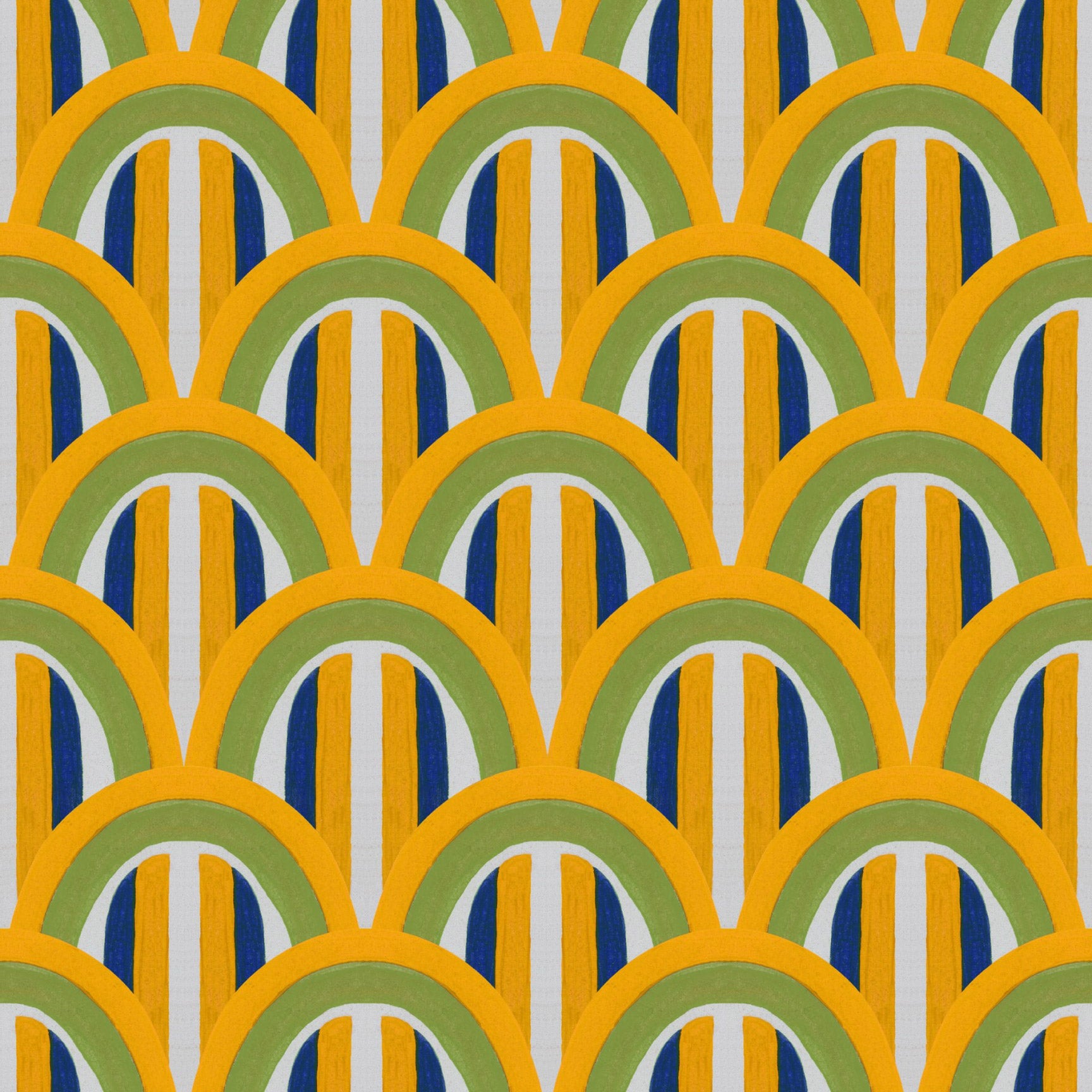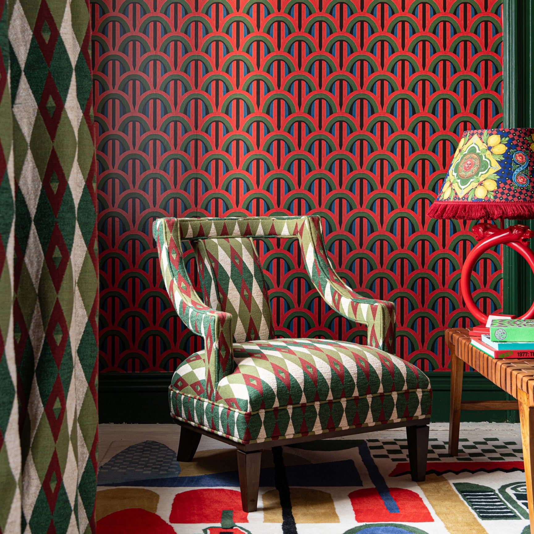 Estivo Wallpaper features vibrant geometric patterns inspired by the ocean and childhood rainbows. The five available hues represent the sunniest months of the year, adding whimsy and nostalgia to any space.