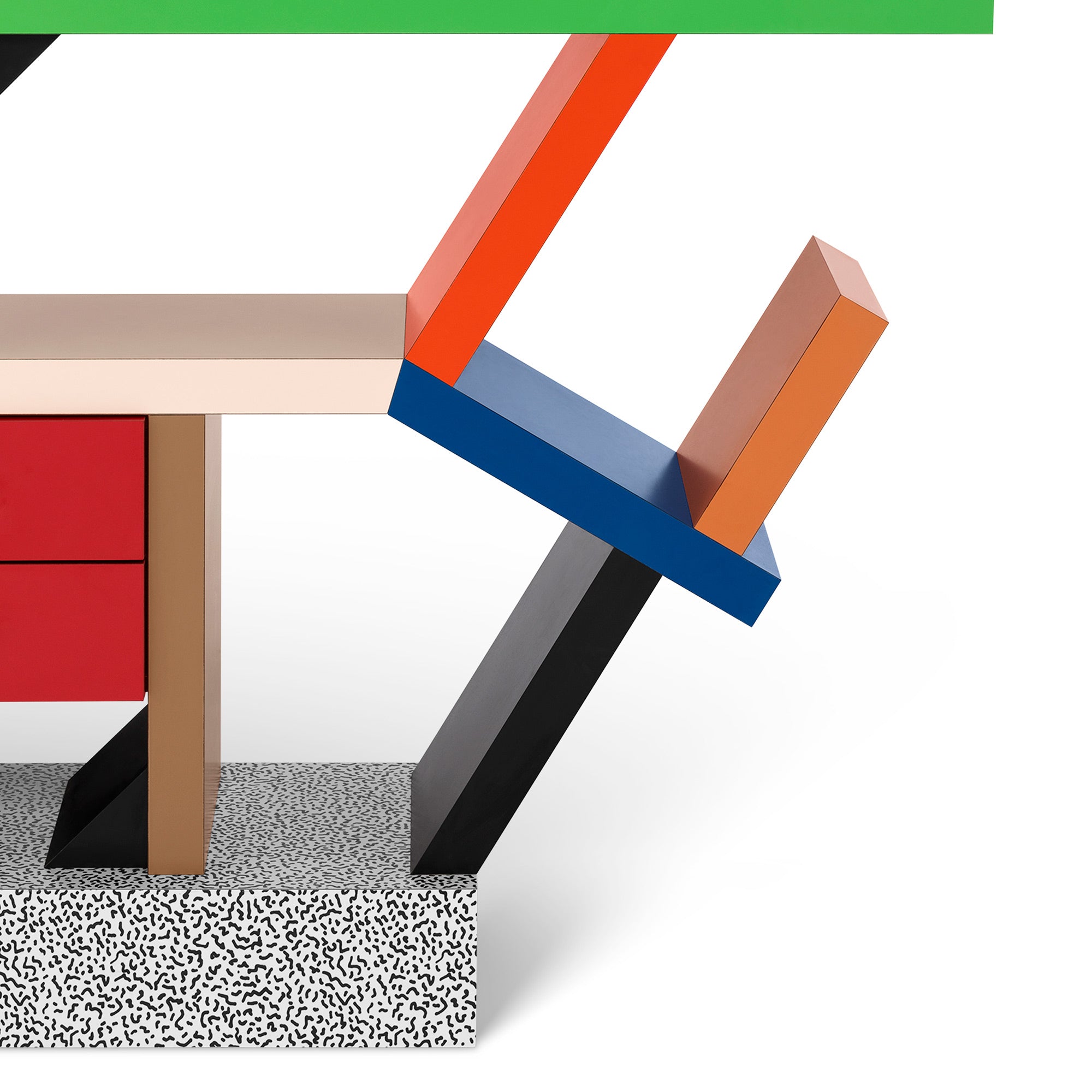This exquisite sculptural piece was designed by Ettore Sottsass in 1981 as a room divider, becoming much more than just a functional piece, thanks to its superb silhouette enriched with an eclectic combination of vivid colours. Its structure is made of wood and plastic laminate. The symmetrical shape gets a dynamic asymmetrical flair, thanks to the various nuances used to mark each element, evoking the allure of postmodernist paintings and sculptures.