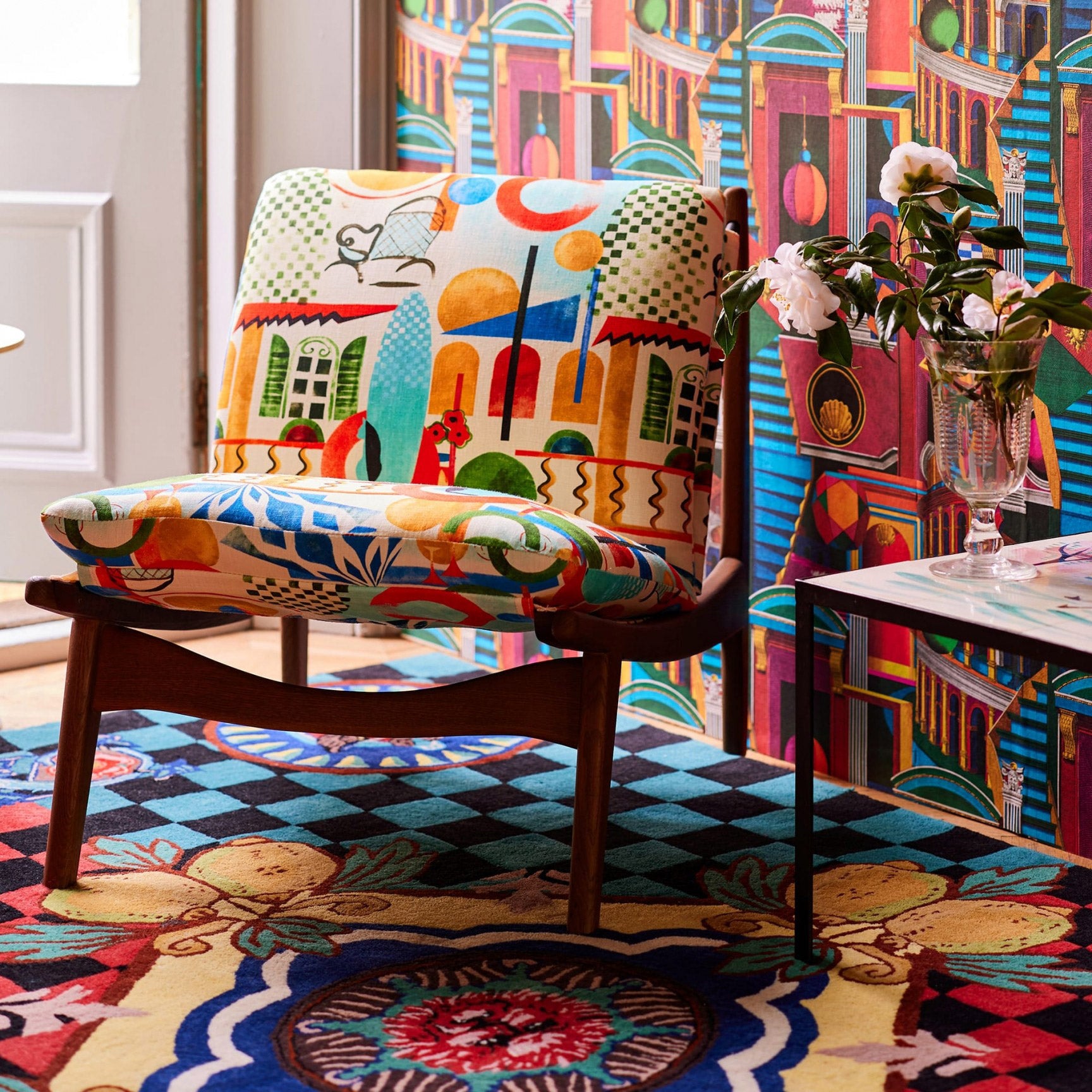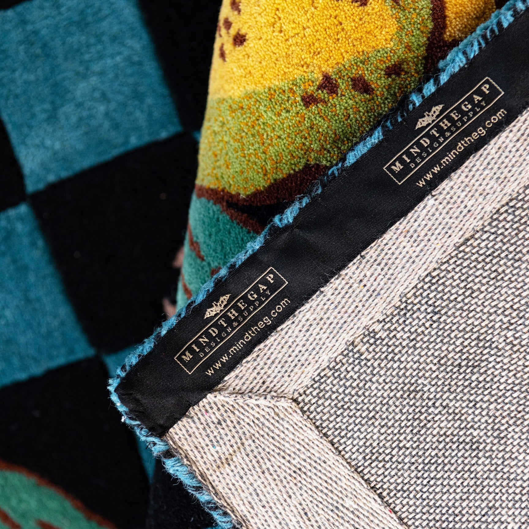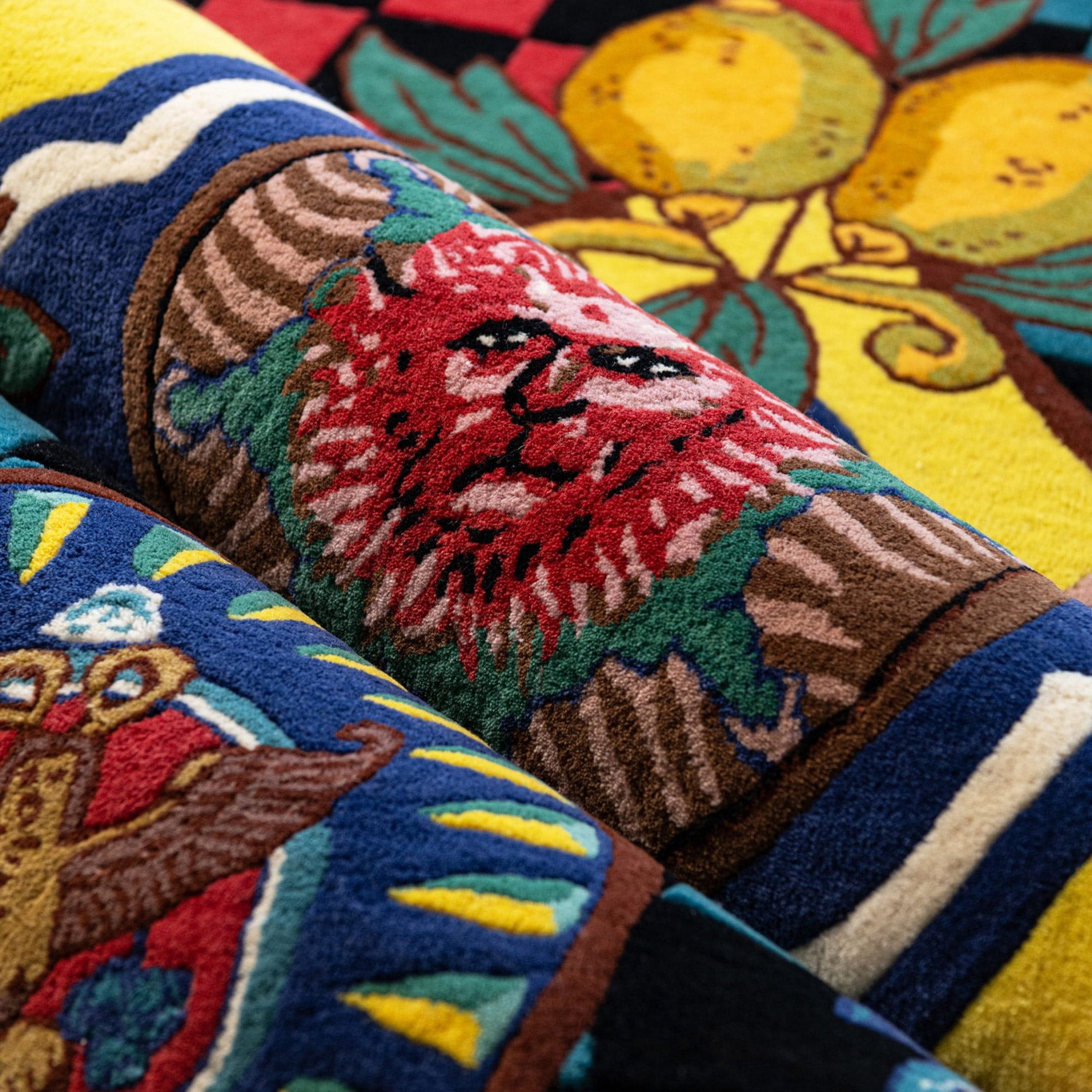 Experience the grandeur of Italy's Amalfi Coast with Amalfi Hand Tufted Wool Rug. Made in India from 100% New Zealand wool, it features a majestic lion, vibrant lemons, and a mosaic background evoking Italian architecture. Transform your space with this stylish rug.