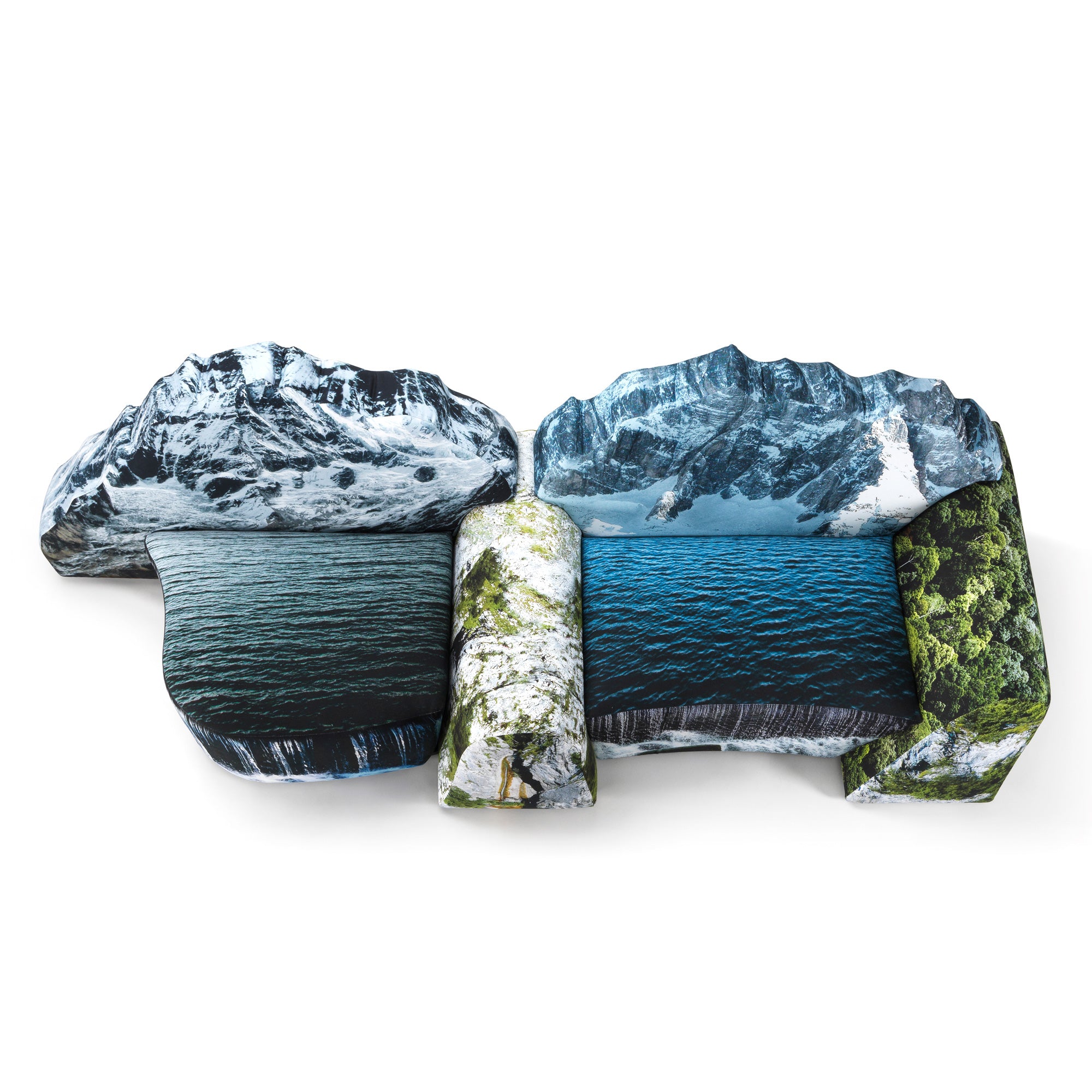 The Montanara modular sofa by Gaetano Pesce is a striking blend of art and function, transforming any room into a surreal mountain landscape. With its printed cotton upholstery depicting snow-covered peaks, waterfalls, and rocky terrain, Montanara brings the drama of nature indoors. Designed for versatility and comfort, its two modules can be used separately or combined, while the soft polyurethane backrest offers a cozy, immersive seating experience. More than just a sofa, Montanara is a sculptural centerpiece that invites conversation and captures the imagination.