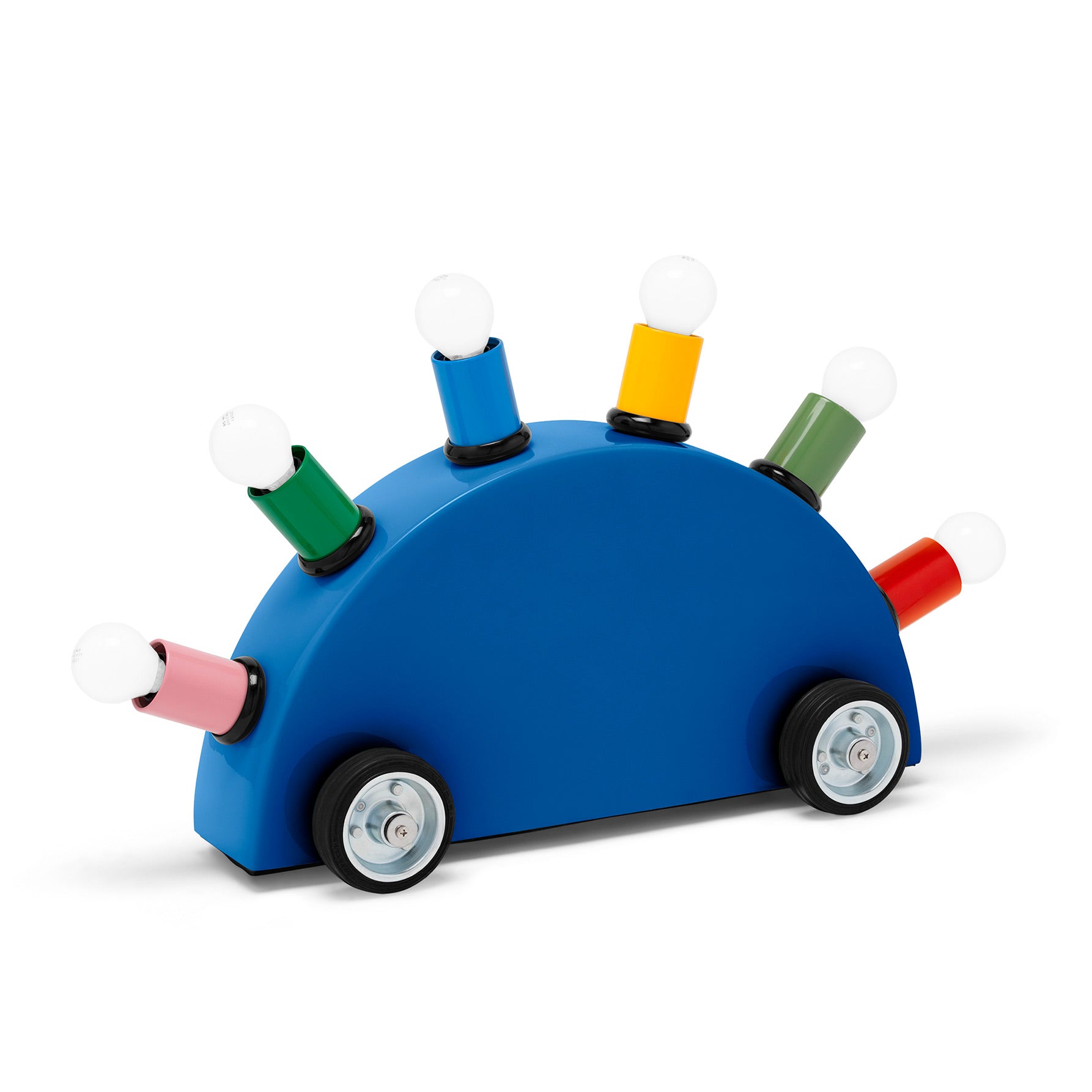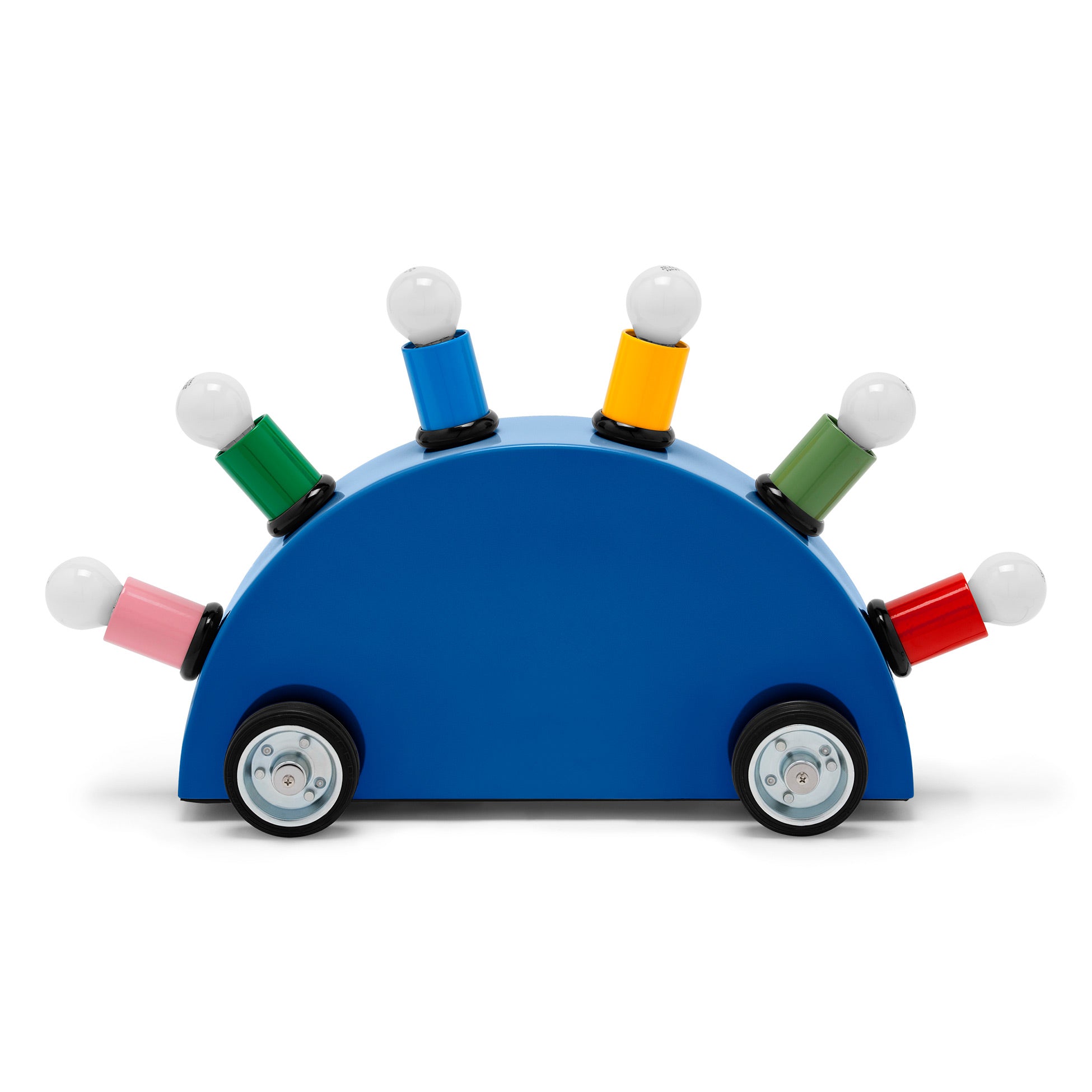 Designed in 1981 by Martine Bedin, the Super Table lamp is one of the Memphis groups most recognised icons. Crafted from fiberglass, this piece features two wheels at the bottom of its half-circular blue silhouette, while the edges are adorned with six bulb holders in pink, green, blue, yellow and red. Comes complete with a certificate of authenticity.