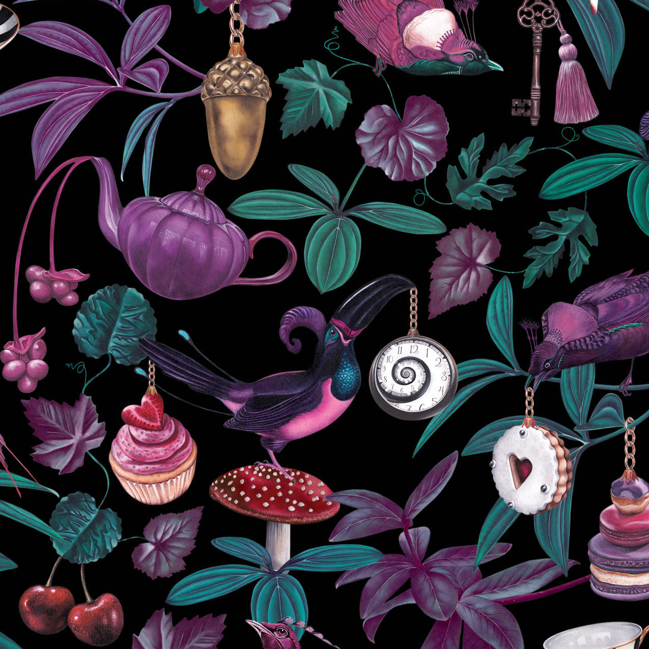 This whimsical wallpaper by Witch and Watchman incorporates a dark background with botanical designs, featuring Bird of Paradise and Alice in Wonderland motifs. The result? A fairytale atmosphere with vibrant shades of green and purple.