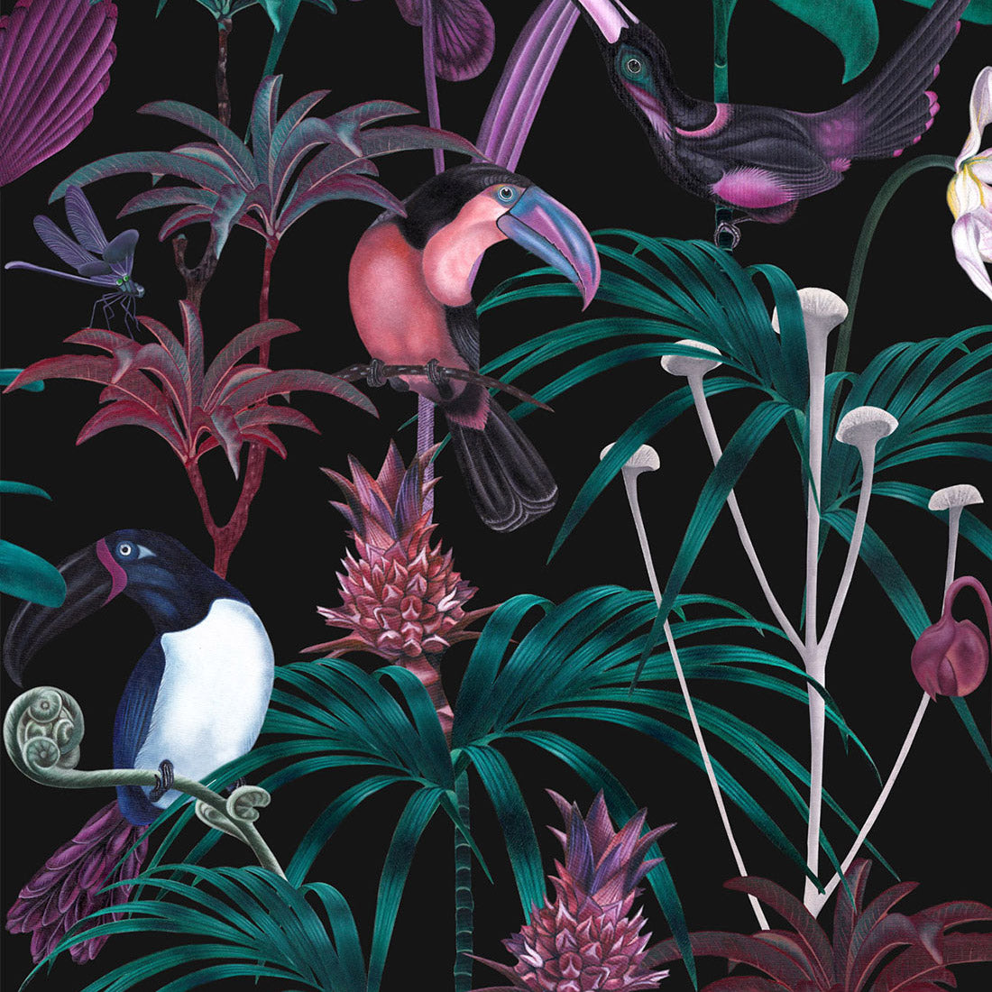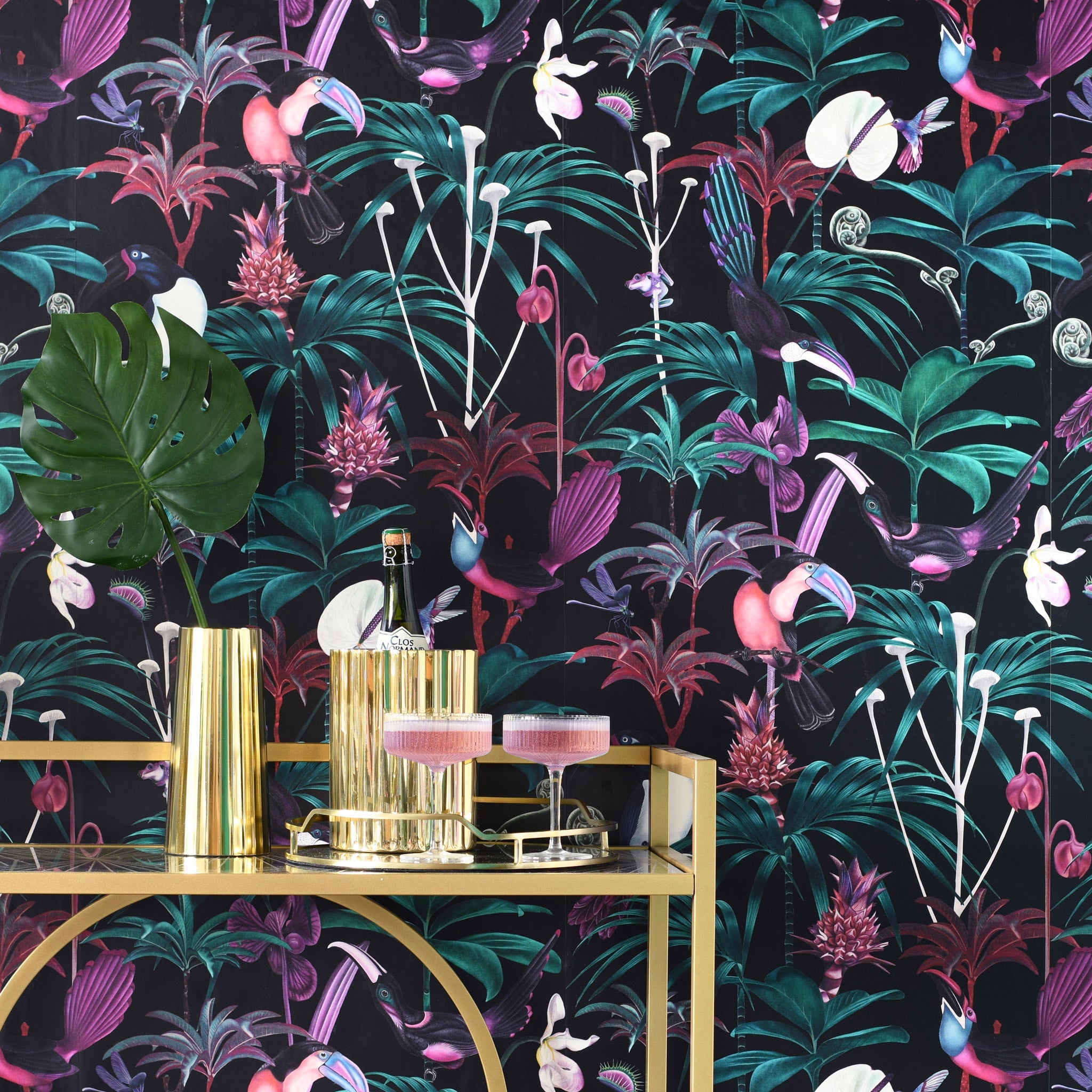 Experience the allure of the jungle with Witch and Watchman's Xanadu Dark botanical wallpaper. Featuring bold black backgrounds and captivating bird designs, this wallpaper is the perfect way to add a touch of drama and exoticism to any space. Explore the intricate details and tropical motifs of this unique wallpaper today.
