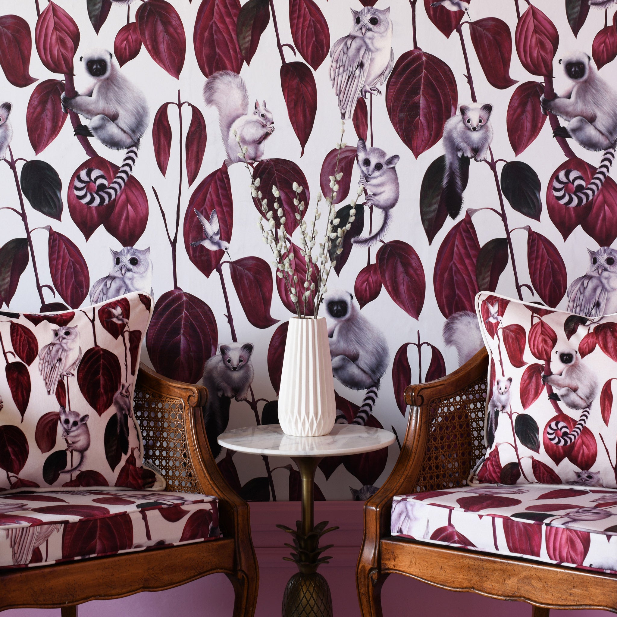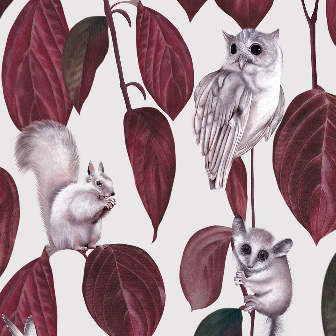 Crafted by Witch and Watchman, this charming animal wallpaper showcases delightful woodland creatures, warm autumn hues, and captivating owl and bird designs to add a cozy, seasonal touch.