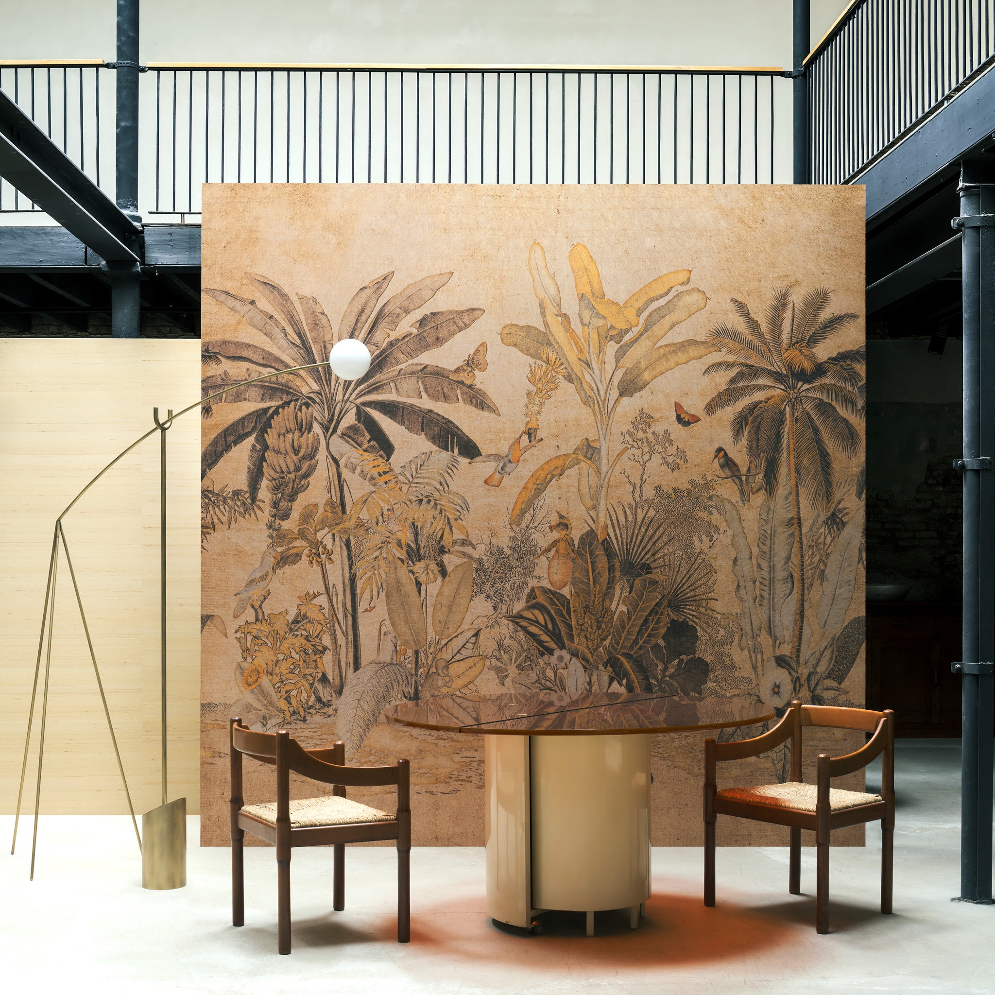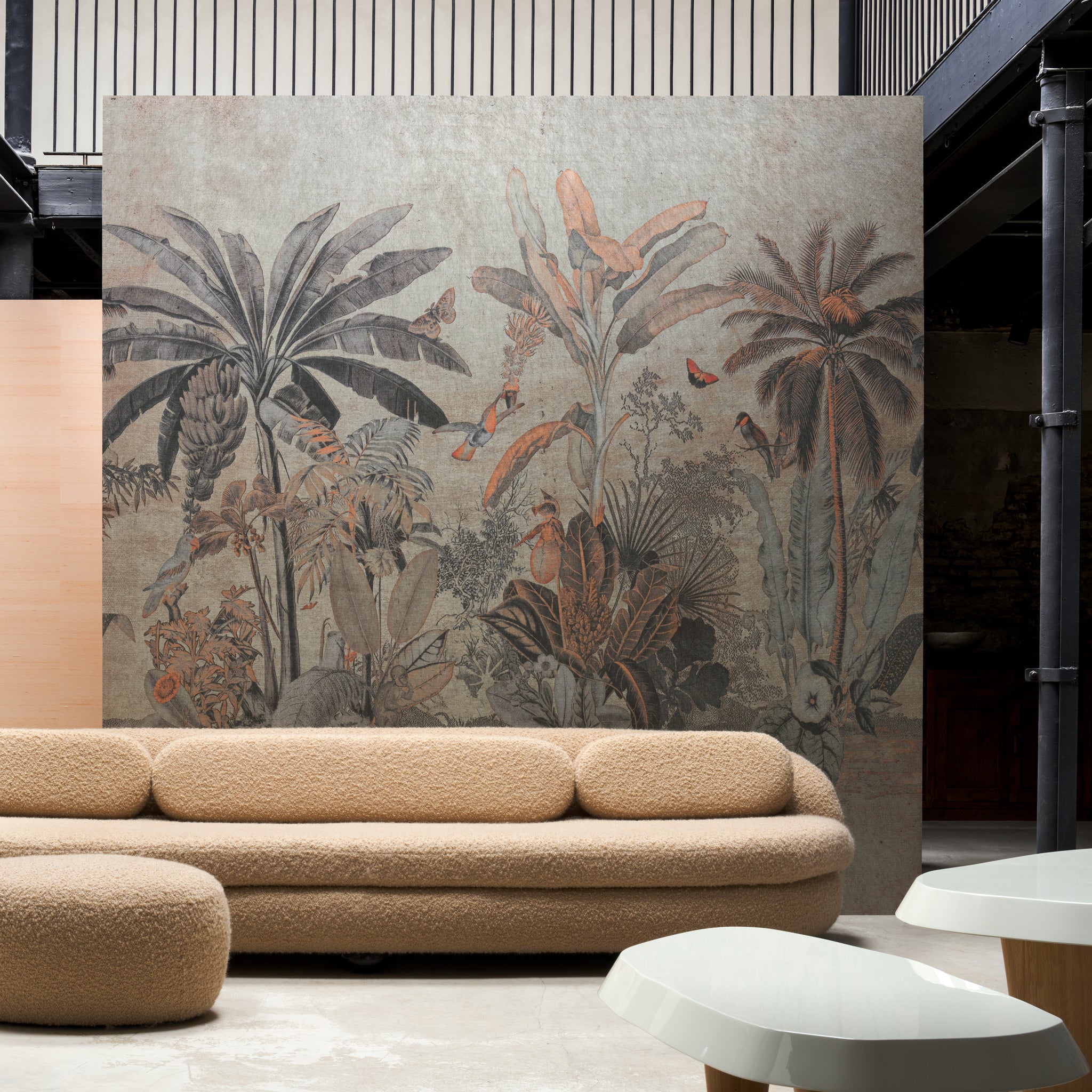 A paradise scene that makes you dream away. Hummingbirds, parrots and monkeys live harmoniously in the land of milk and honey. This panoramic is printed on a background with a parchment paper look for an unmatched vintage effect.