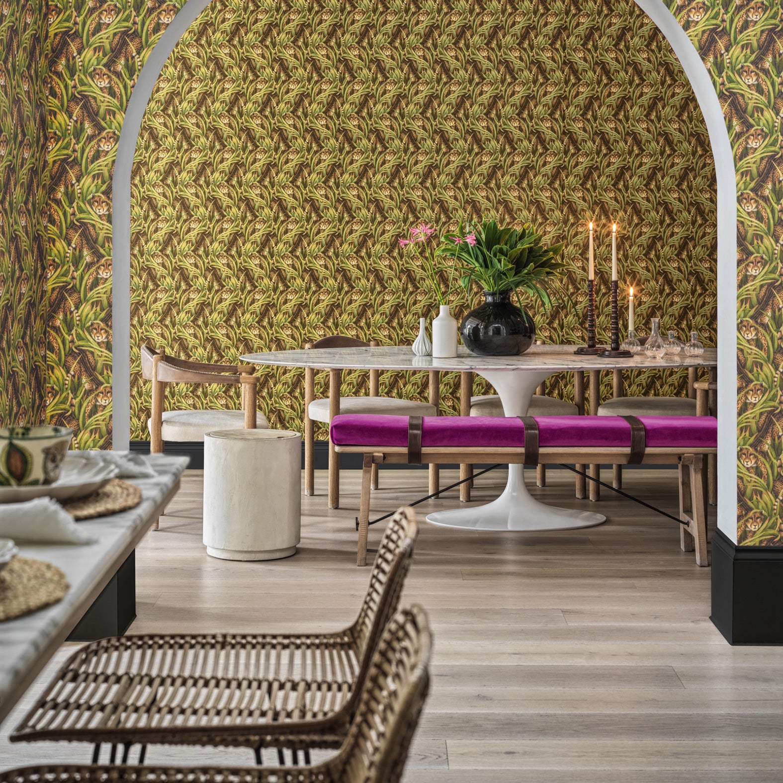 A parade of King Cheetahs with their distinctive three-striped back stalk through the feather-like grasses of the alluring Cheetah Prowl. Famed as one of the rarest animals in the world, the elusive King Cheetah is both mythical and beguiling. Palettes of Grass, Bronze, and Slate are akin to the South African landscape across the seasons, with a hot Cerise adding truly vibrant colour and pattern.
