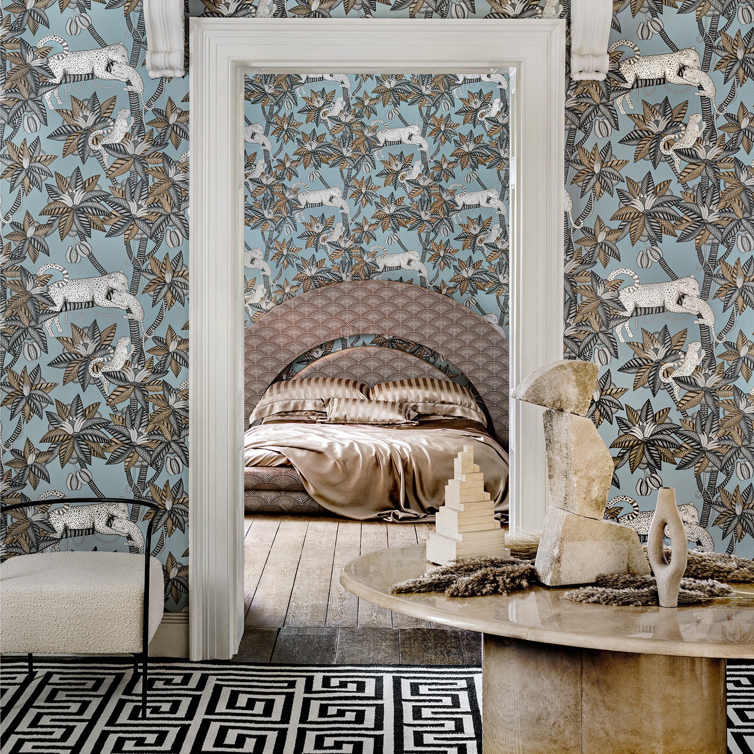 Experience the magic of Satara Camp in Kruger National Park, where Big Cats roam freely. Witness a heartwarming moment as a mother leopard guides her cub up a tree, showcasing her fierce maternal instincts. Satara perfectly captures this special bond between a mother and her cub. This peaceful design is available in six contemporary colourways.